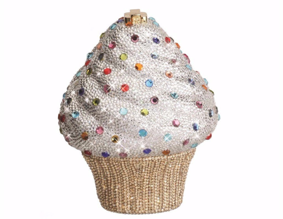 Sprinkled with multi-colored Swarovski® crystals, this handcrafted Acacia wood bag is a whimsical Art to Wear piece that delights the eye — and sparks conversation. With its sculpted cupcake silhouette, handmade hinges, and chain shoulder strap, it’s a radiant reminder that fashion should be fun.