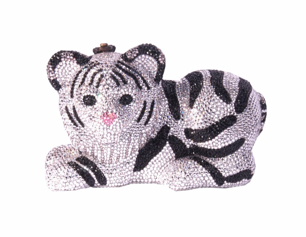 Hand-carved from natural Acacia wood, this baby tiger handbag is adorned with hand-set Swarovski Elements crystals, blending fierce charm with refined artistry. Finished with a satin lining, U-lock closure, and drop-in shoulder strap, Snow Cub is a bold collectible with a soft side.
