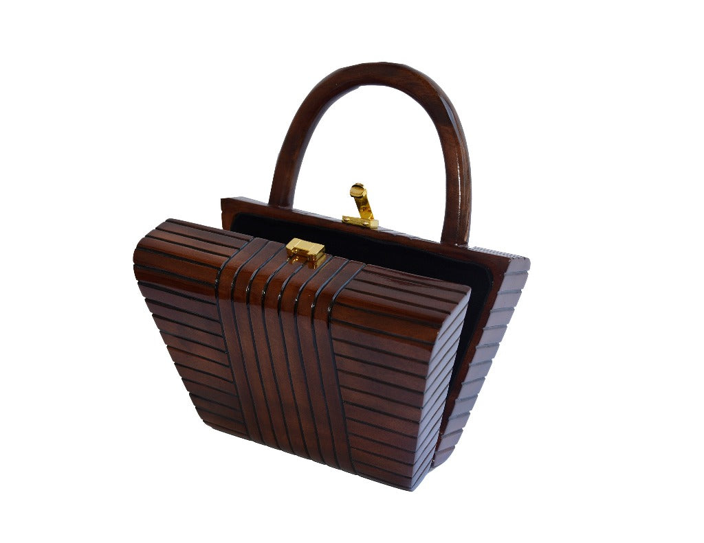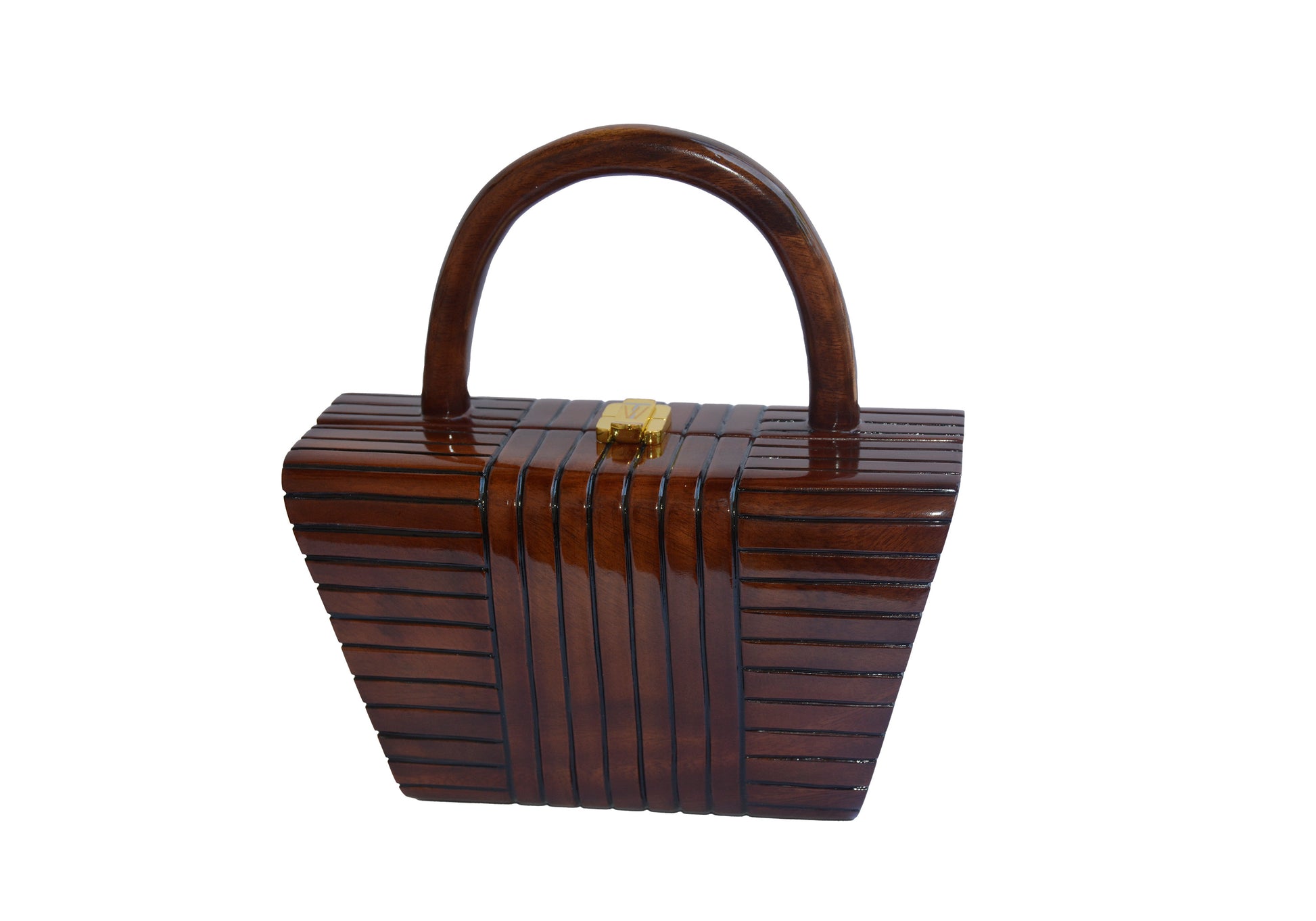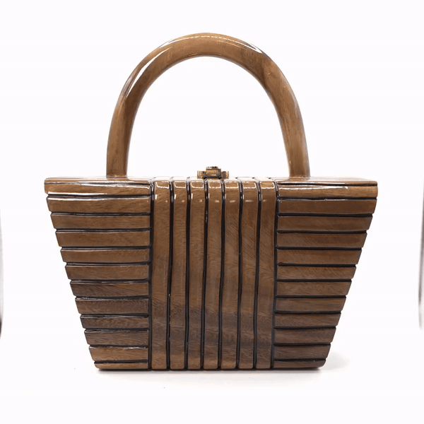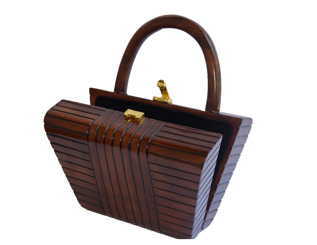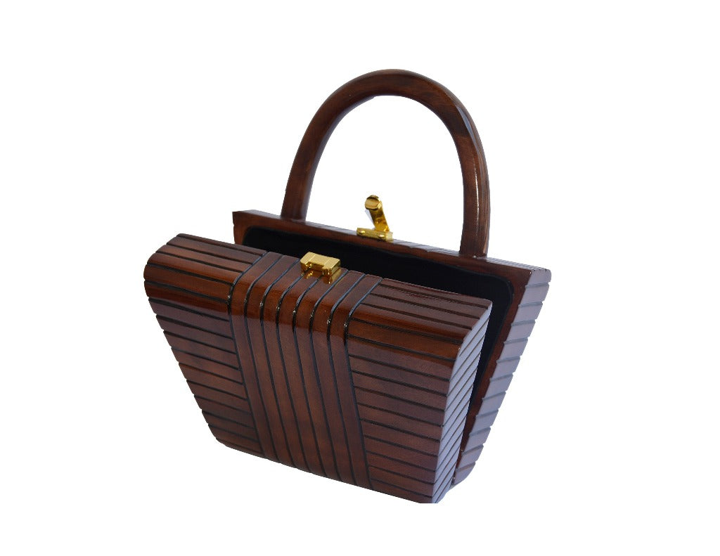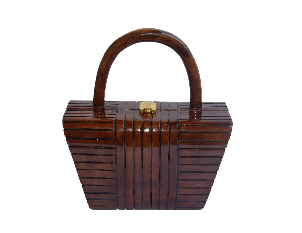 This unique handbag is expertly crafted from hand carved acacia wood, featuring a striking diagonal and vertical line pattern. The wooden top handle adds a touch of luxury, while the handmade signature hinges and TW lock provide exquisite detail. Designed to fit all cell phones, this handbag measures 5 1/2" in height, 9" in width, and 3" in depth.