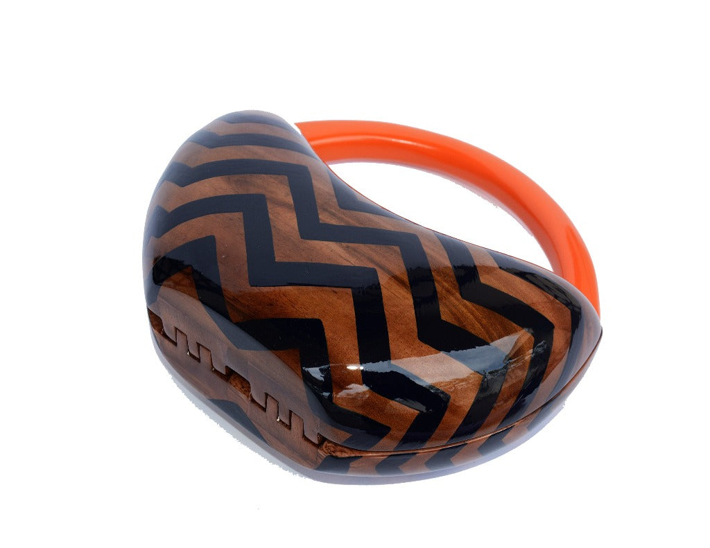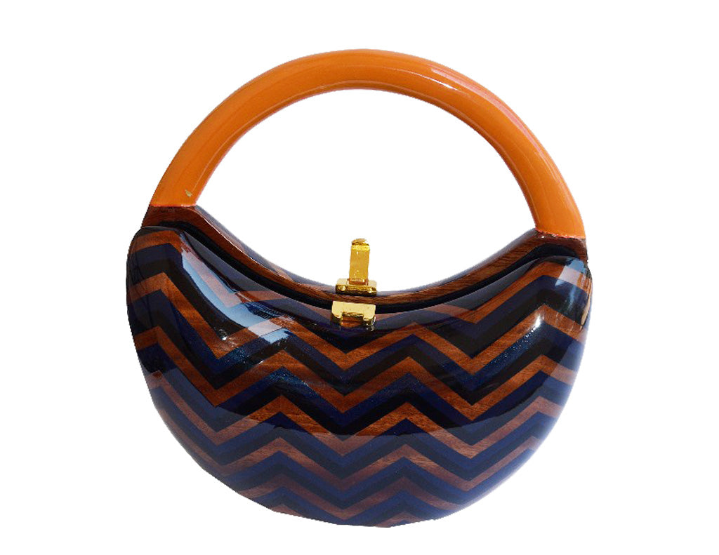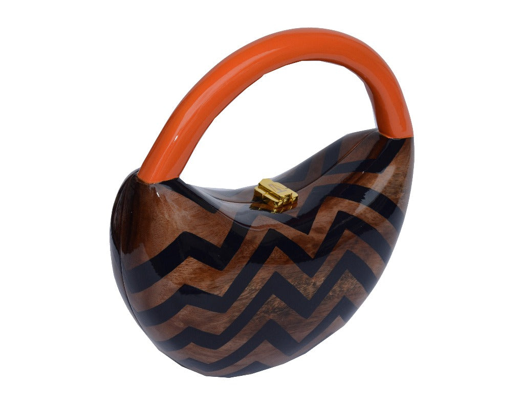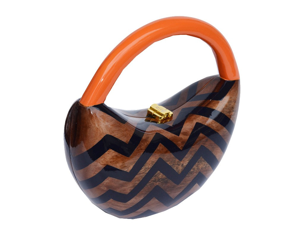 Fashion Colored. This Sculptured Acacia Wood is Perfectly Hand Carved A Zig Zag Pattern Showing the Natural Wood Mixed With Black and Roay Circular Top Handle Accented Burnt Orange. Hand Made Signature Hinges. TW Lock. Handbag Dimensions: 4 1/2" H x 10" W x 2 1/2" D. This luxurious handbag is handcrafted from sculptured acacia wood, showcasing a beautiful zig zag pattern that combines natural wood with black and royal circular accents. The signature hinges and TW lock add an exquisite touch, making it the perfect accessory to elevate your fall wardrobe.