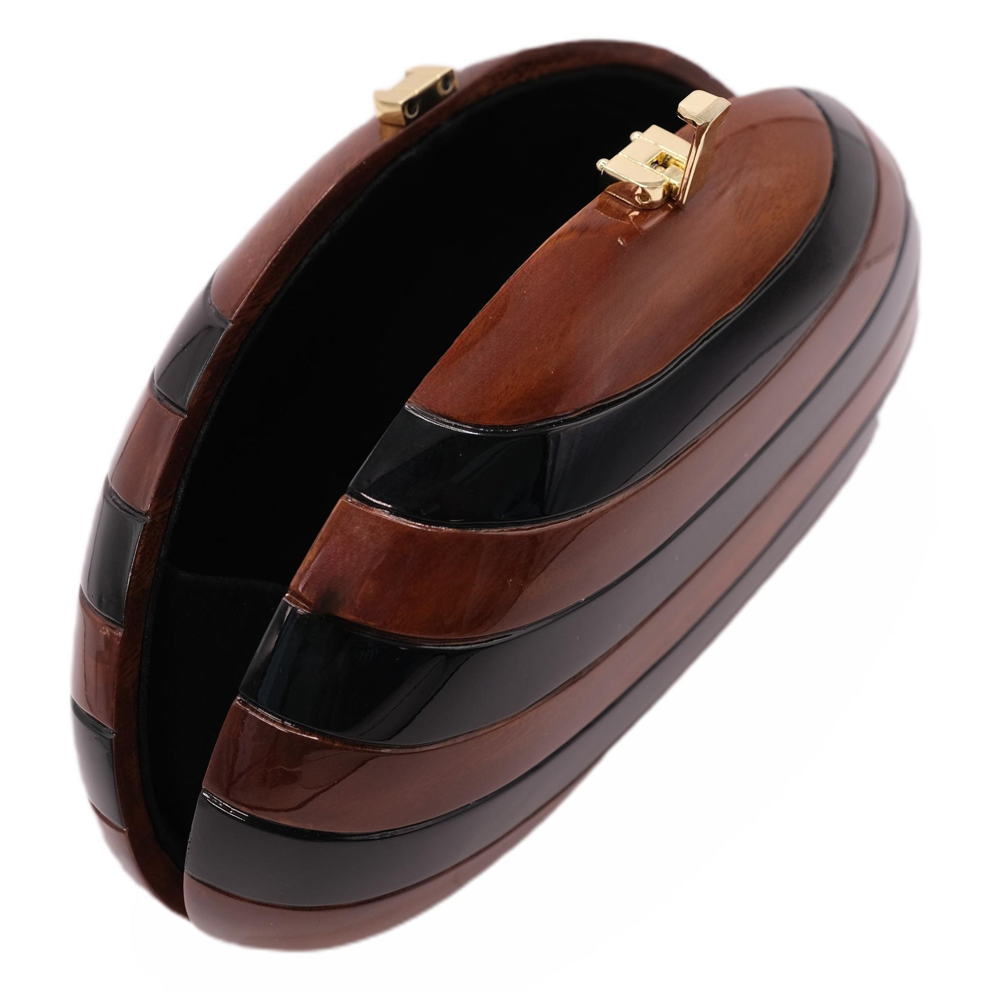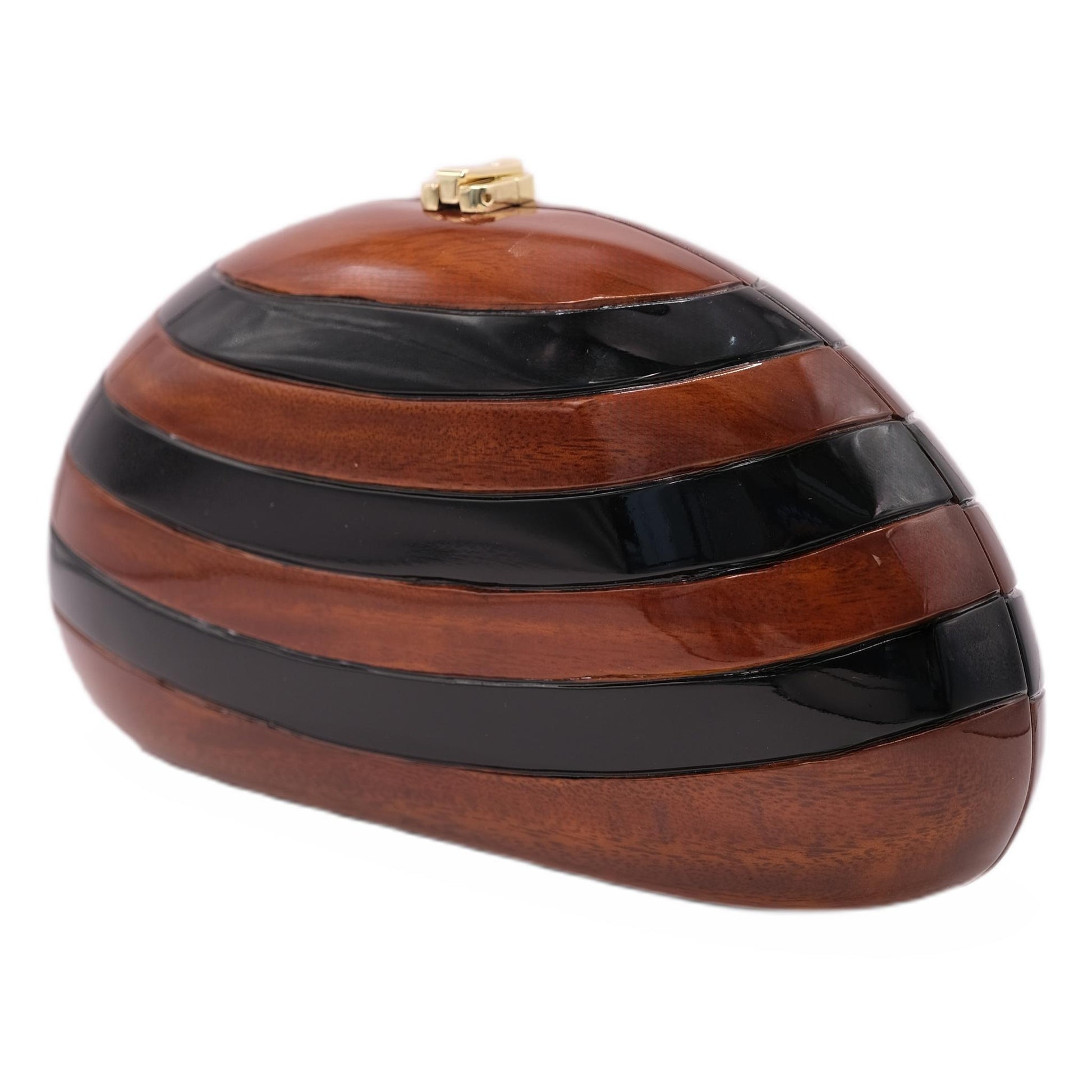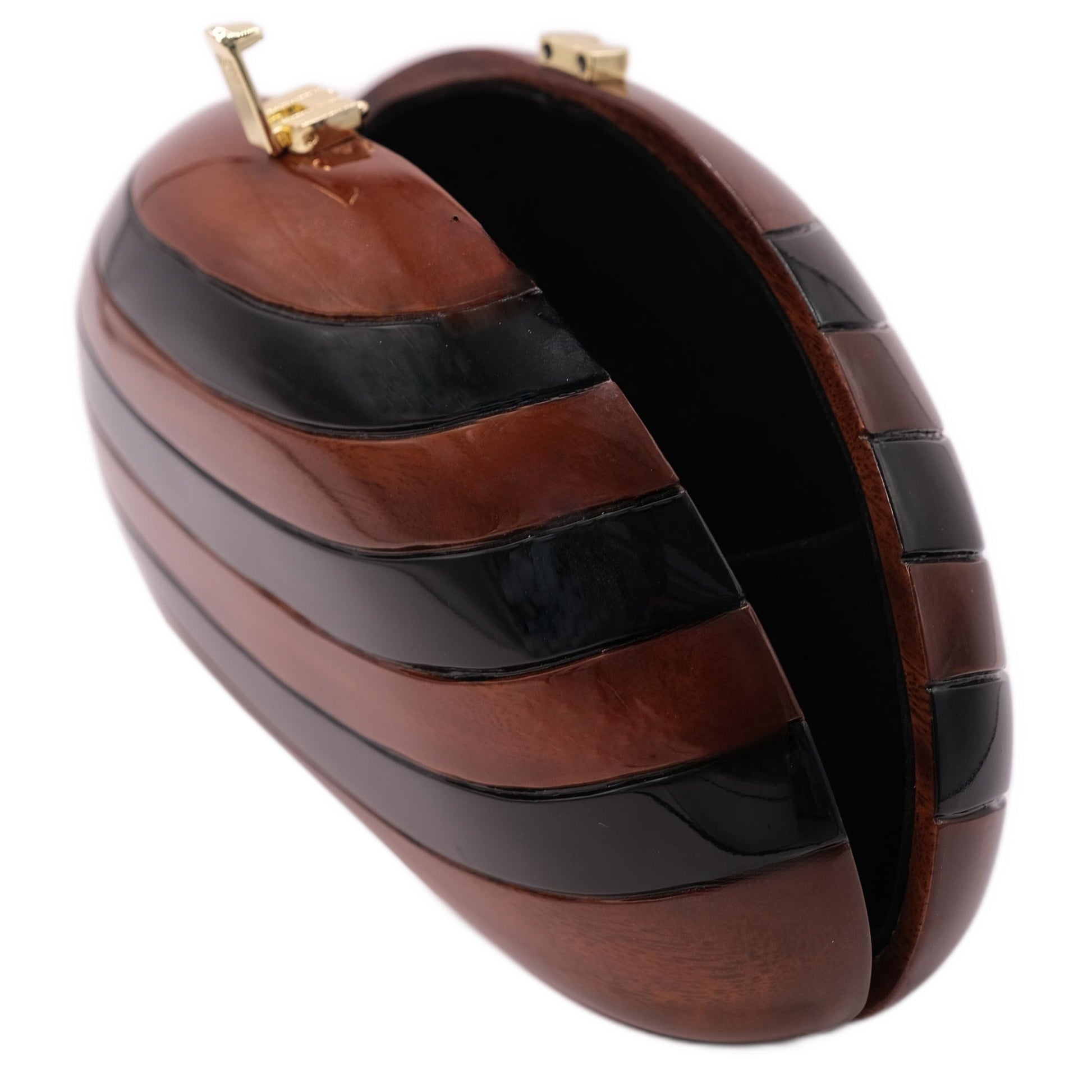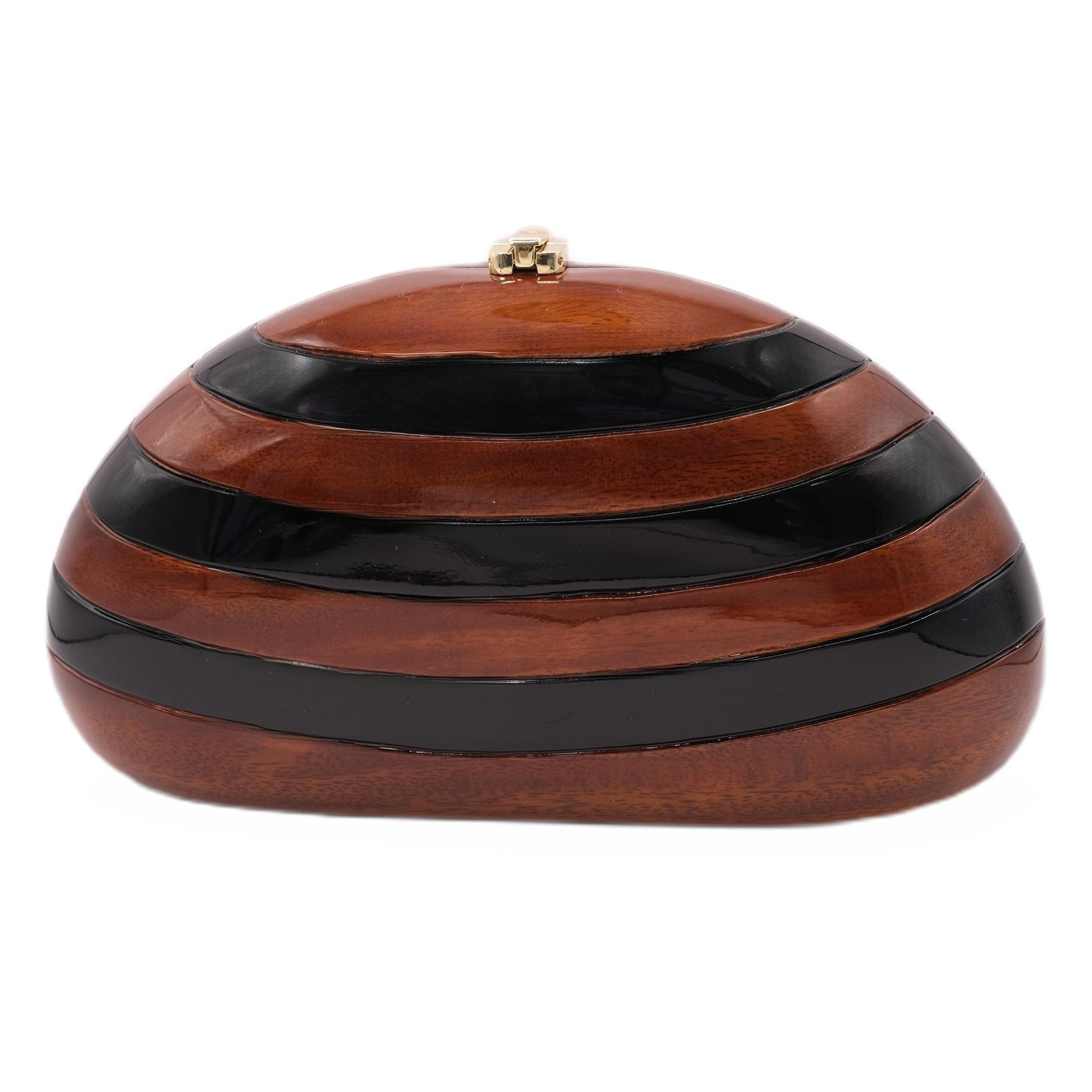 Elevate your style with this beautiful, simplistic clutch. Crafted from oval-shaped acacia wood, it features a stunning hand-painted black ebony finish that elegantly encircles the shape. The clutch is designed with a secure TW lock and a twisted black cord for added flair. The handmade hinges reflect meticulous craftsmanship, ensuring both functionality and aesthetic appeal. Perfectly sized to accommodate your cell phone and essentials, this clutch is a chic accessory for any occasion. Handbag Dimensions: 5 1/2" H x 9 1/2" W x 3 3/4" D.