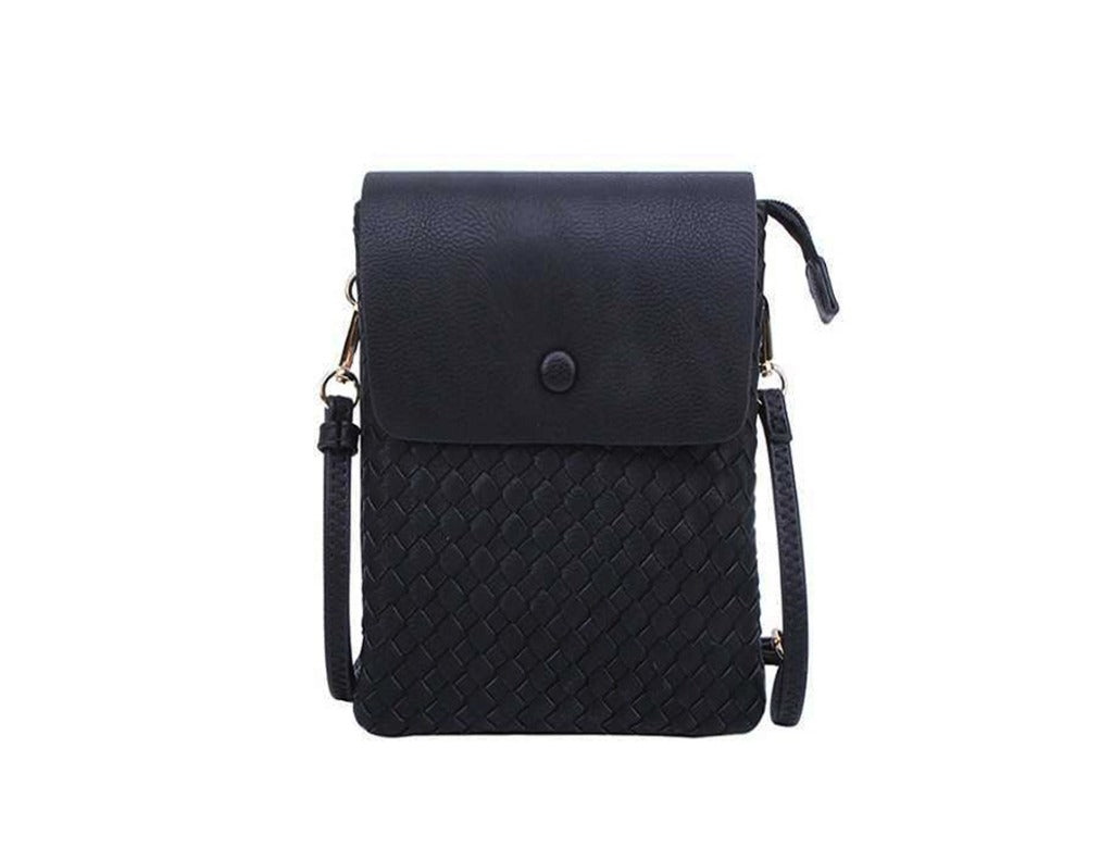 BLACK VEGAN LEATHER CRISS CROSSED DESIGN CROSSBODY BAG.
