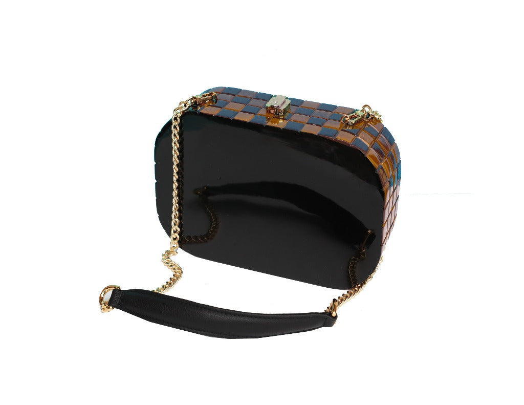 Pam Nat/Black. Sophisticated Hexagon with Squares Carved and Painted in Black leaving the Natural Wood exposed allowing the contrast of detail banding the bag a TW Clasp and 2 different size straps one cross body. Highly Collectible Accessory for Home Furnishing as well as Art To Wear TW Lock. Handbag Dimensions: 5” H x 8” W x 2 1/2” D