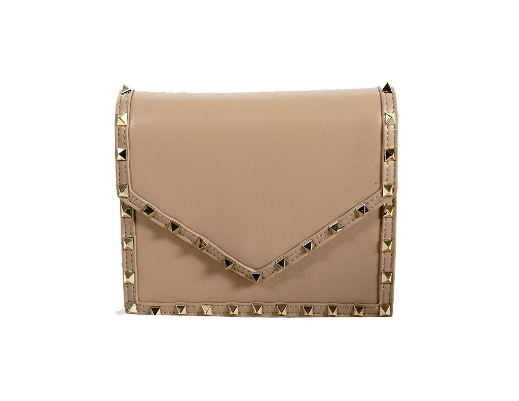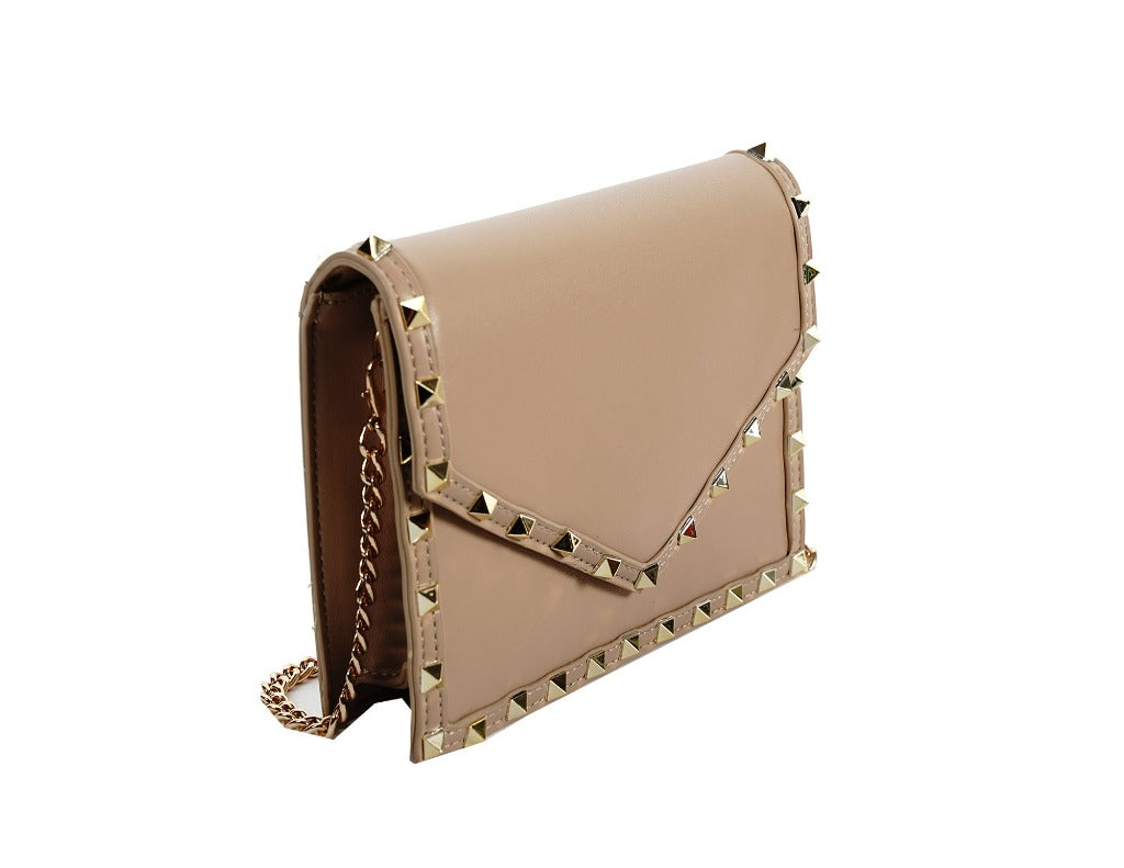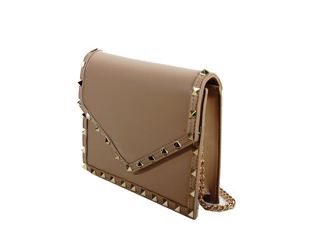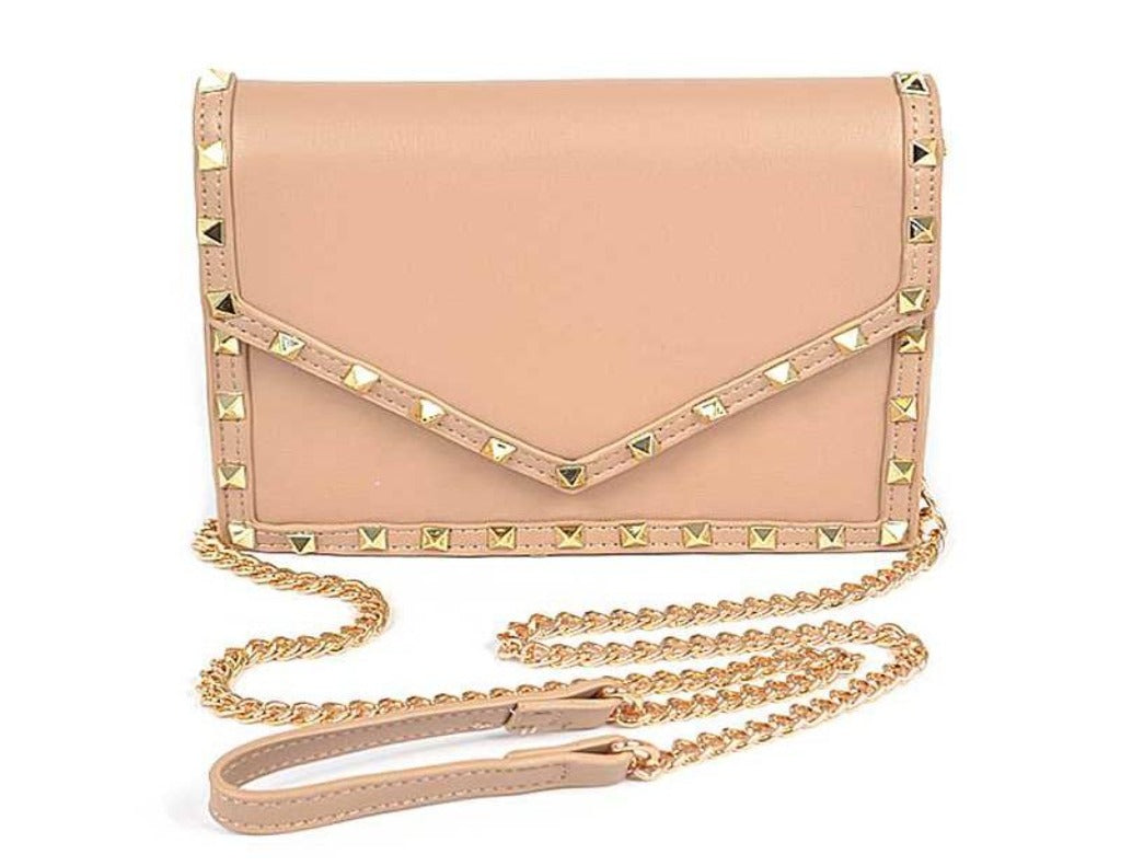 Timmy Woods Studded Beige Soft Vegan Leather Clutch. Chain shoulder Strap. Dimensions: 5" H x 8" W x 2" D