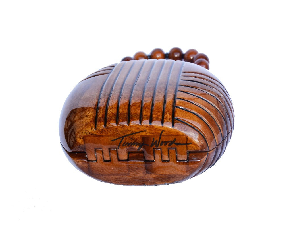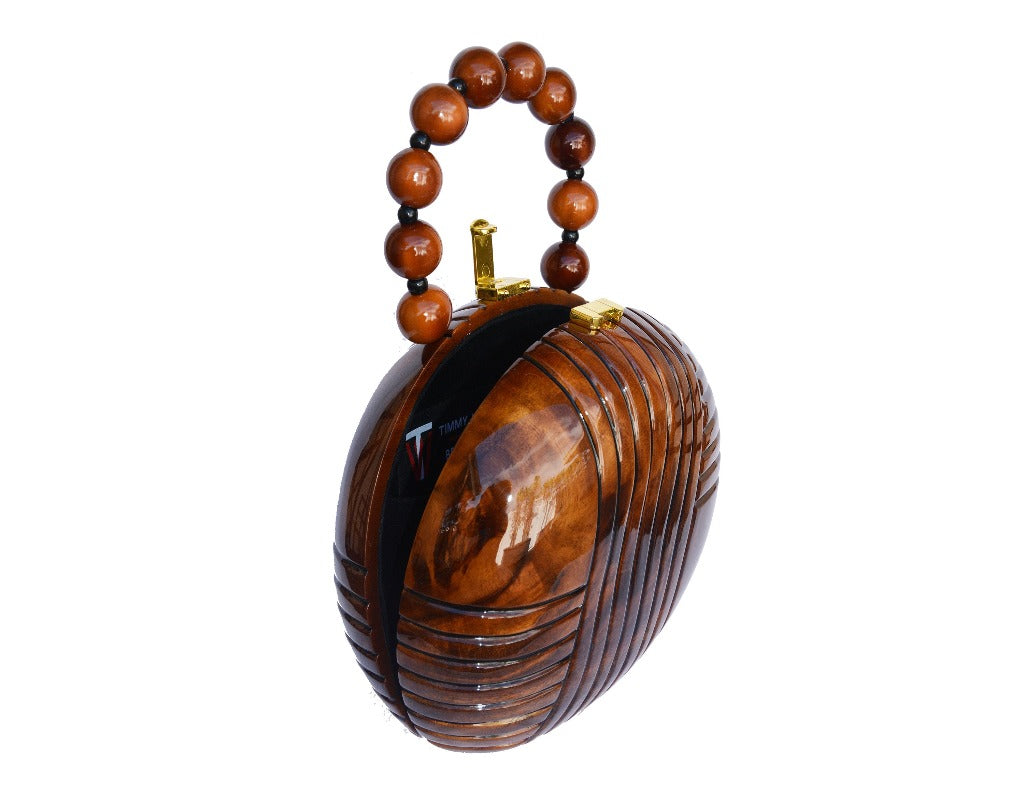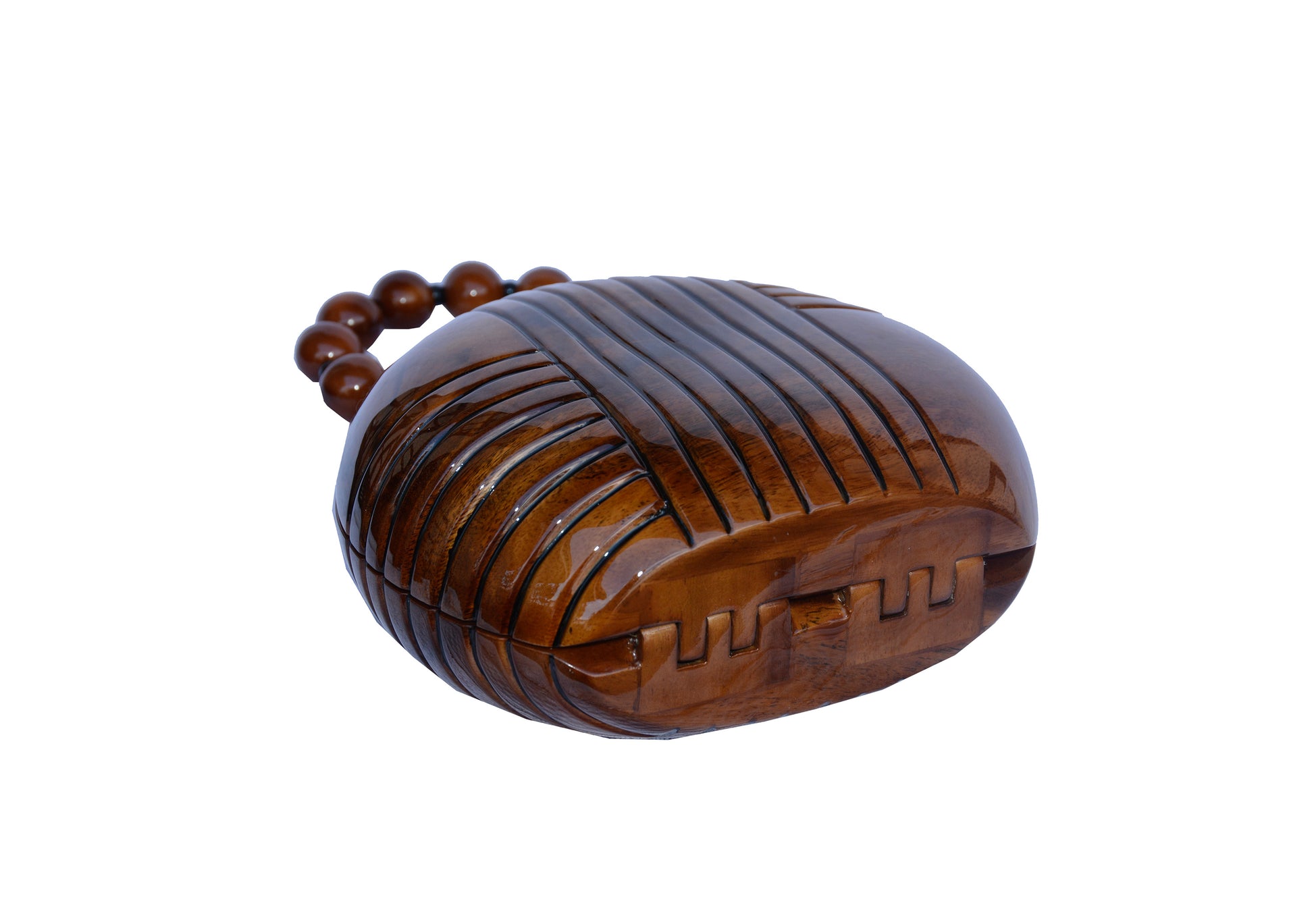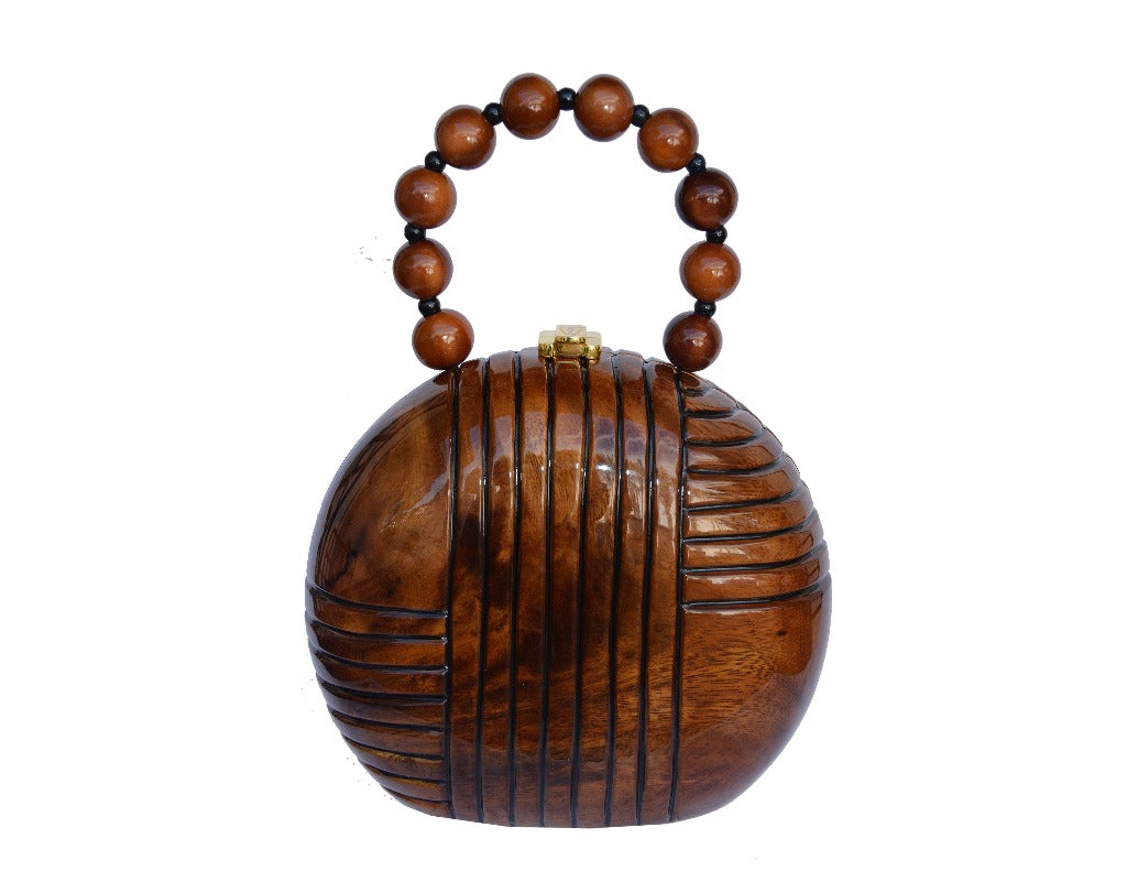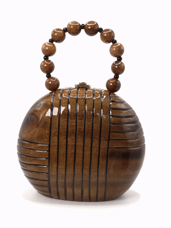 Experience luxury with Clovis Natural handbag, a stunning blend of art and fashion. Made of Acacia Wood and signed by Timmy Woods, this circular handbag features a unique design with black lines. Dimensions: 7" H x 8" W x 3" D.