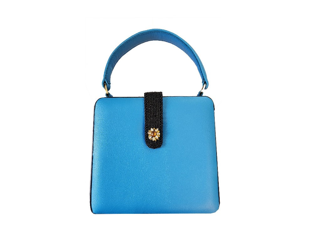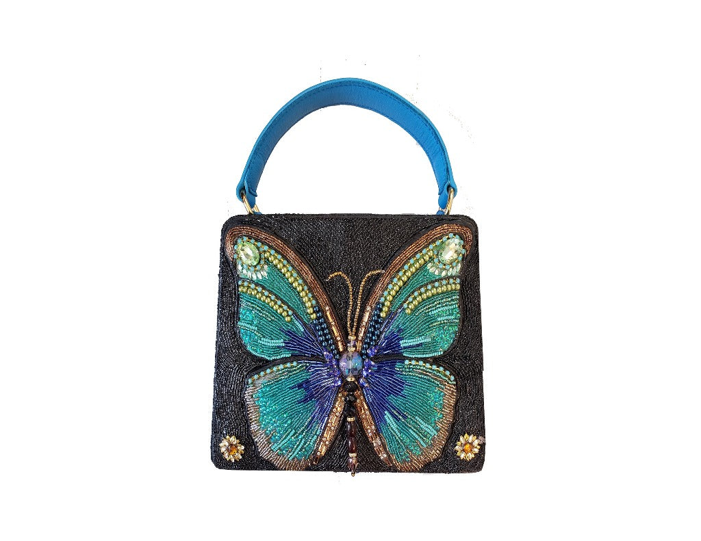 Monika Butterfly - Beautifully designed. Hand beaded with snap closure. Top Handle with Chain shoulder strap. Handbag dimensions: 7" H x 7" x 3" D.