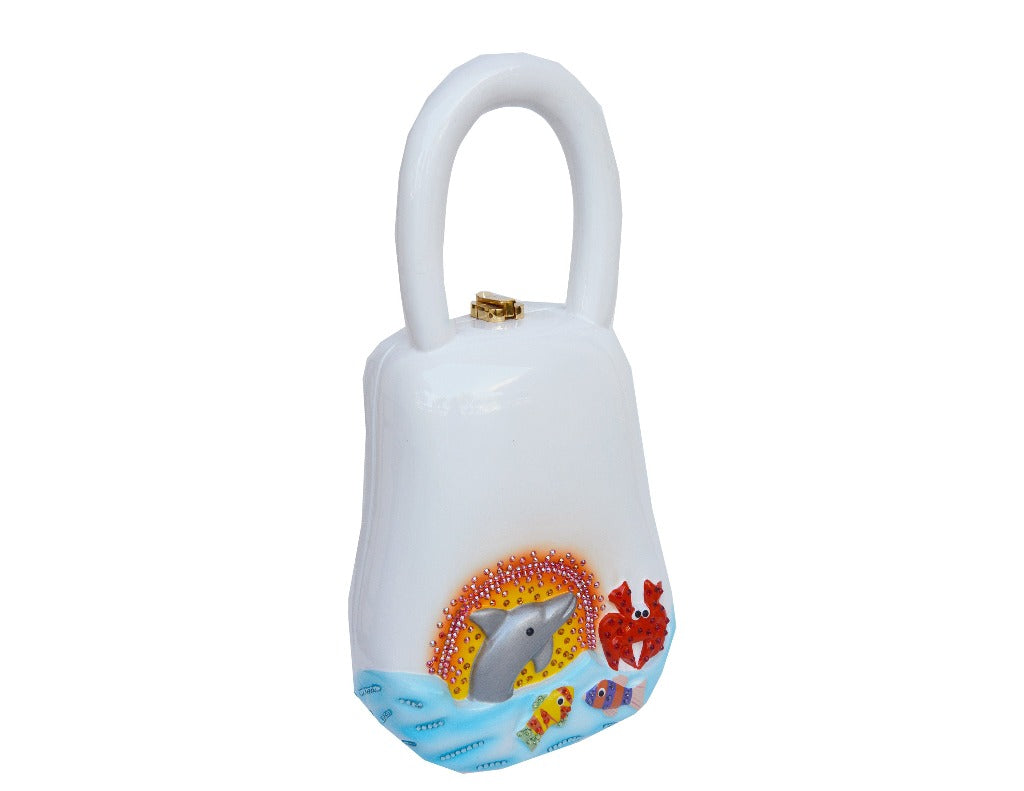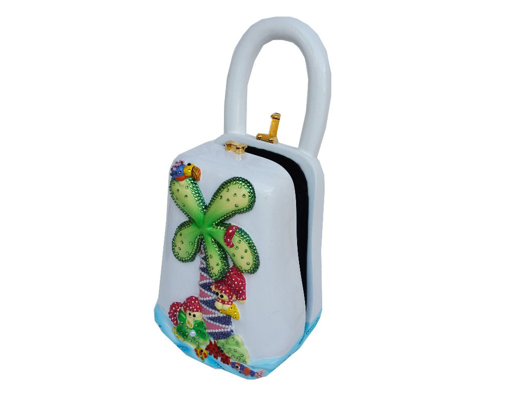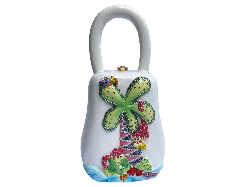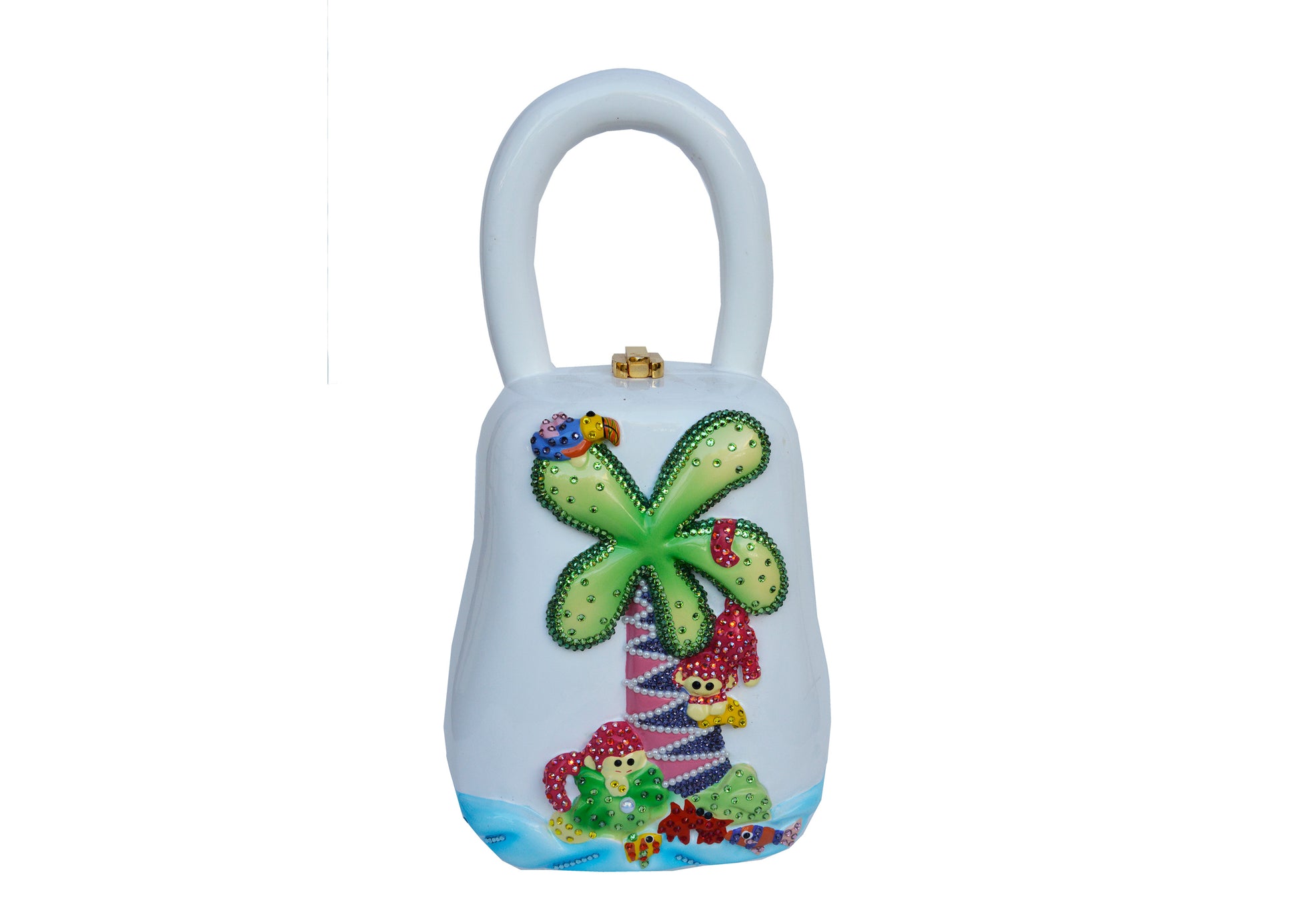 Palm Tree Island Accented with Pearls and Swarovski Crystals on the Palm Tree. Behind the handbag is a Dolphin swimming and the sun is rising over the sea. The Unusual shape vertical bag with a top lock. Handmade of Acacia Wood and the Crystal and Pearls are applied in the USA. Handbag Dimensions: 7" H x 5" W x 3" D.