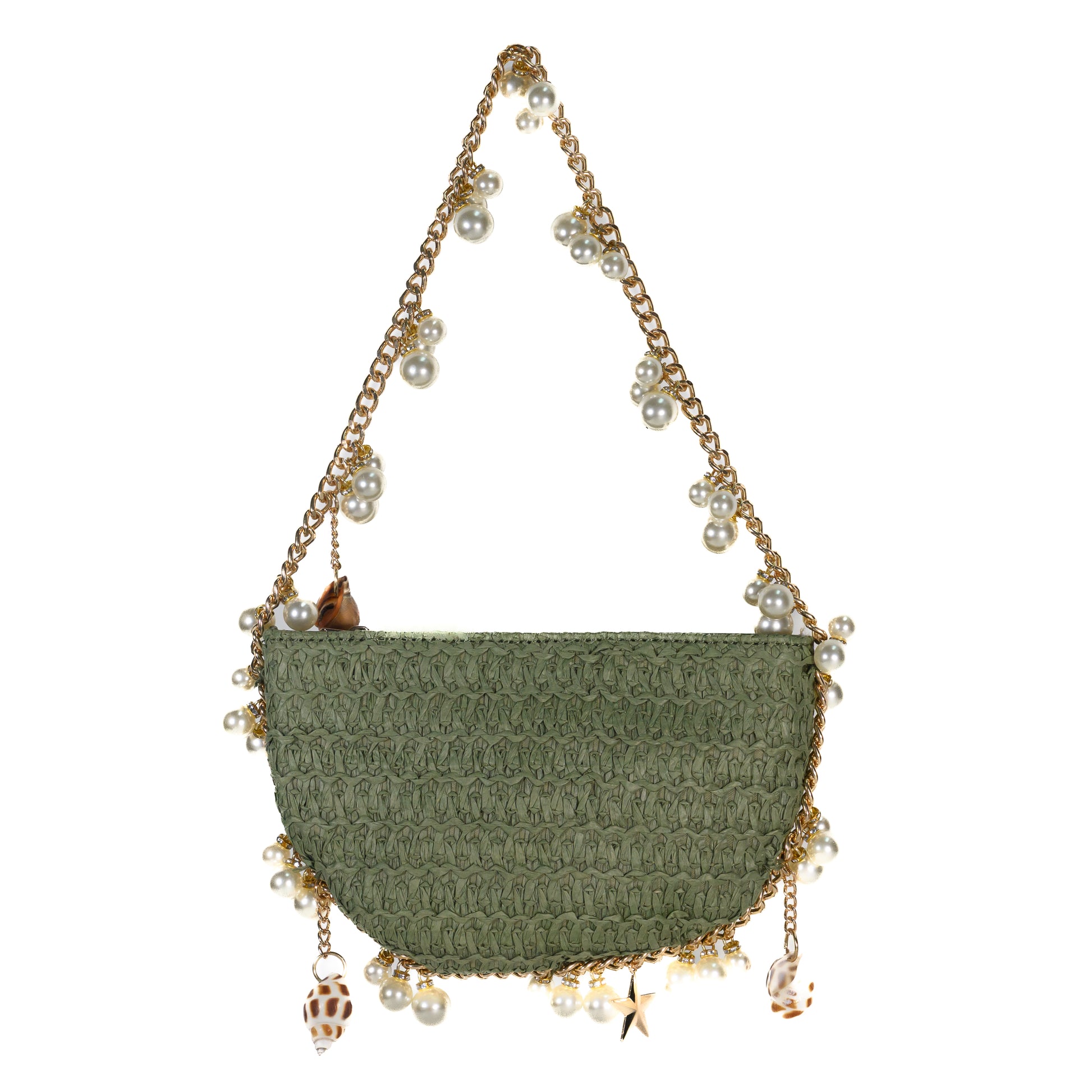 The Shiloh Sage Evening Bag by Timmy Woods Beverly Hills is a refined expression of coastal elegance and modern sophistication. Featuring an intricate woven design, this beautifully crafted piece is accented with luminous pearls, delicate shell details, and polished gold-tone hardware, evoking a timeless seaside charm with a touch of glamour.
