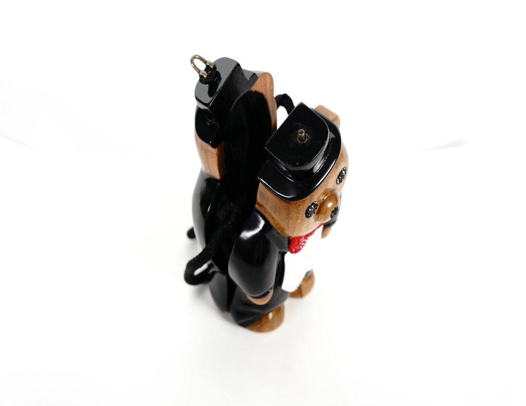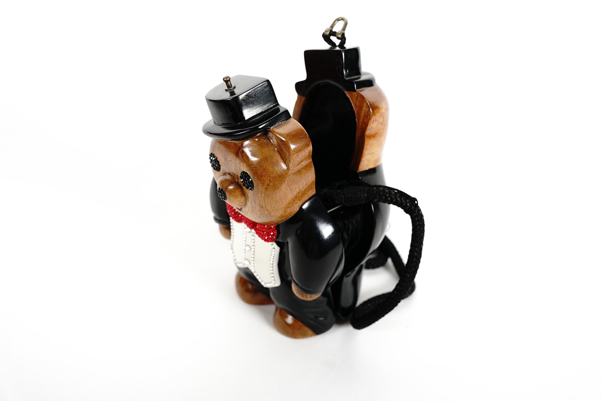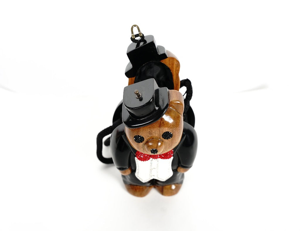 Teddy Bear with Stones - Stylized teddy bear design ready to go with his top hat and vest. Handmade from carved Acacia wood body with hand-painted suit and hat in black, white vest and red bow tie. Finished with high gloss lacquer. Enhanced with sparkling Swarvoski crystals on the eyes, nose, bow tie, and edging of vest. TW Lock closure; Satin lining; Small inside pocket; Drop-in Shoulder Strap included.