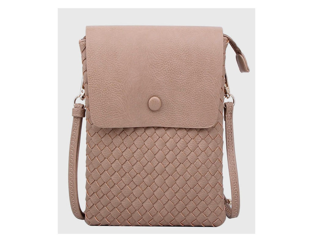 TAUPE VEGAN LEATHER CRISS CROSSED DESIGN CROSSBODY BAG.