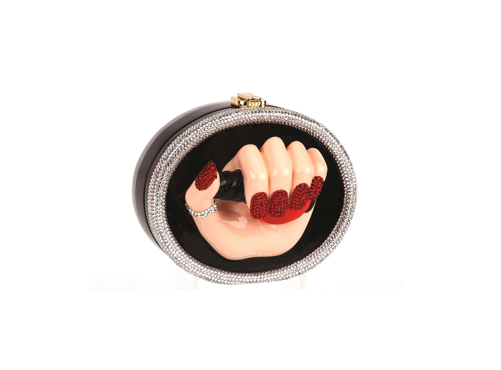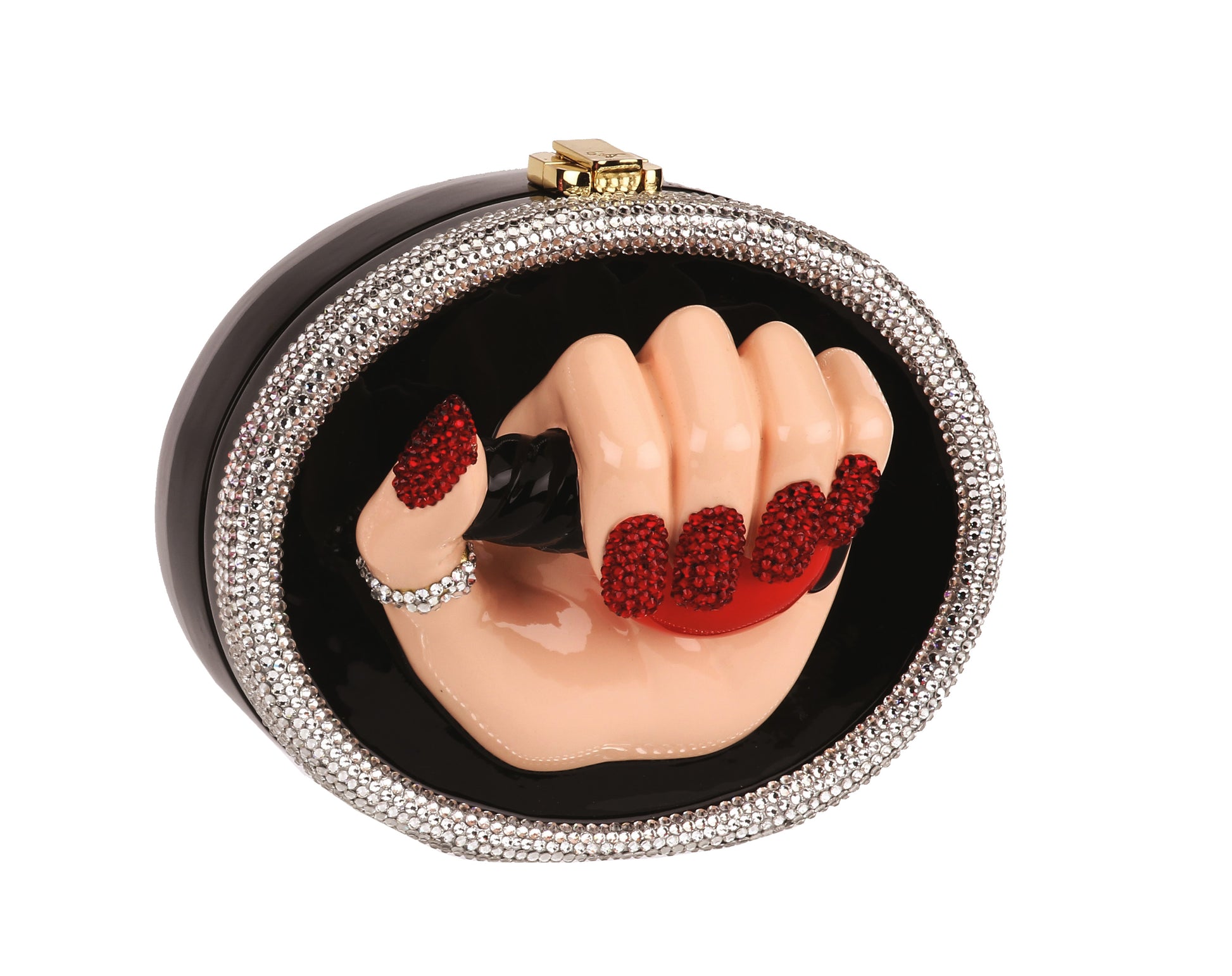 A Hand Carved Hand with Beautiful Red Swarovski Crystal Nails Holding a Bottle of Nail Polish. Placed on an Oval Hand Painted Shape. This is a Sculpture, It Is Special! If you are in the Beauty Business This Handbag is A Must! Artist Know How Difficult It is to Make Hands, The Bag has a TW Lock, and a Drop In Shoulder Strap