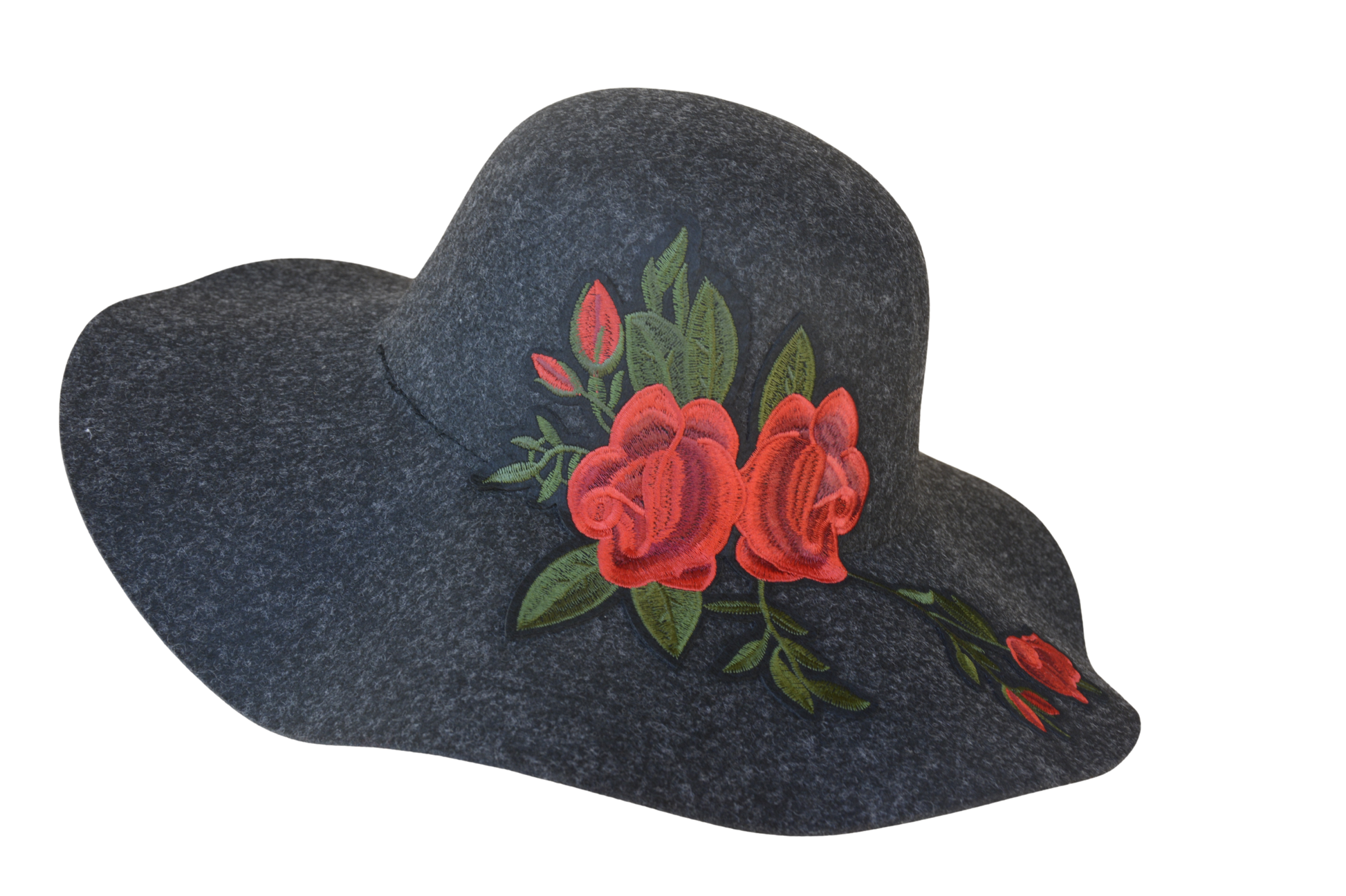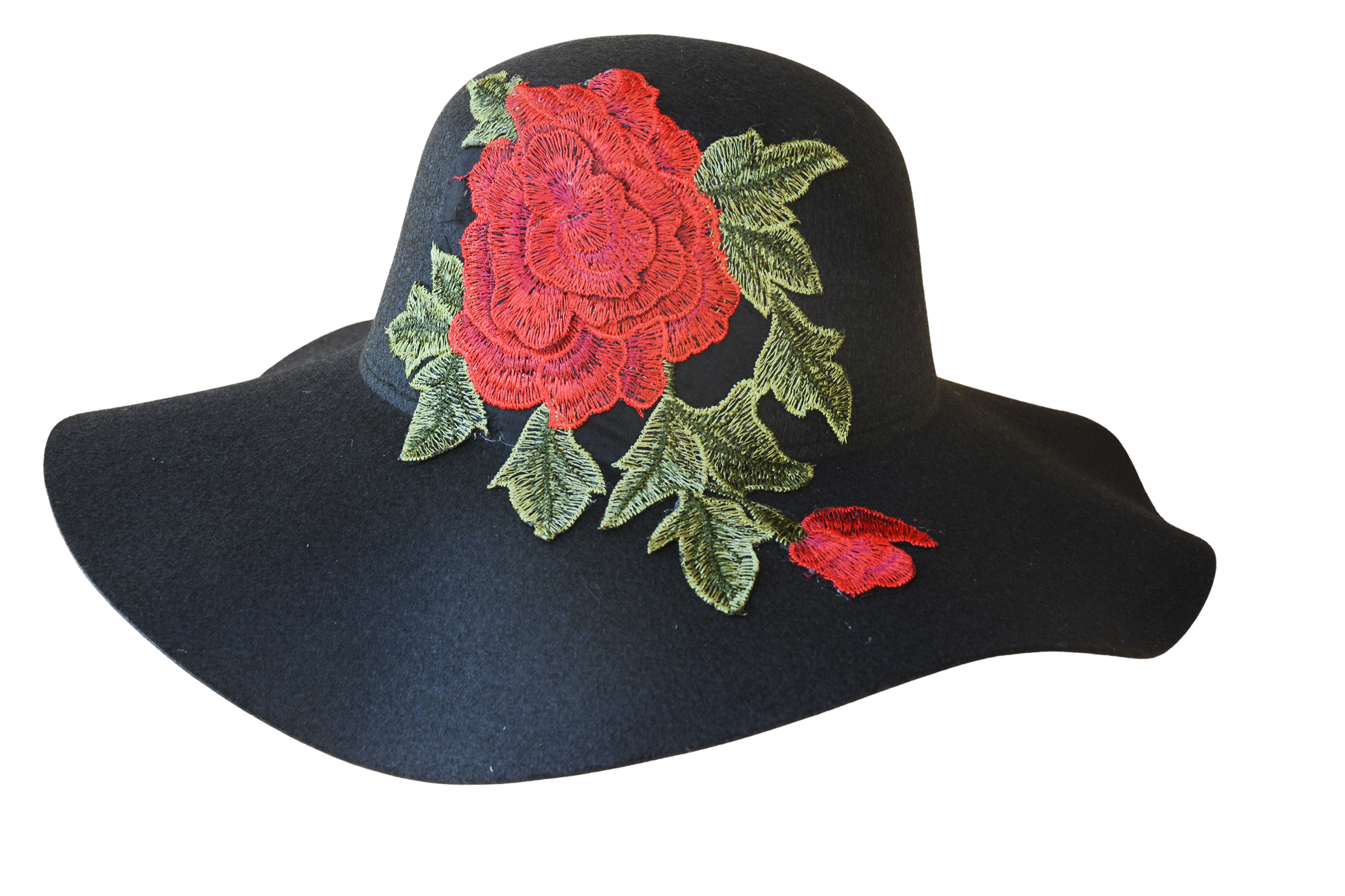 Luxuriously Crafted Felt Hat with Embroidered Red Roses Cascading onto a 4” Brim