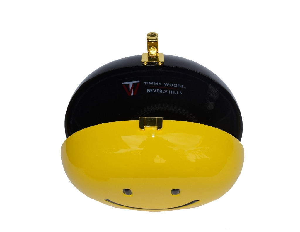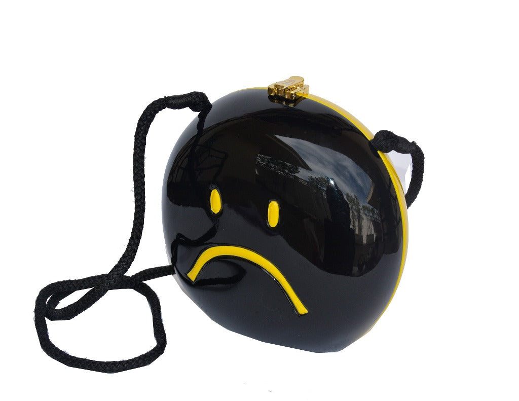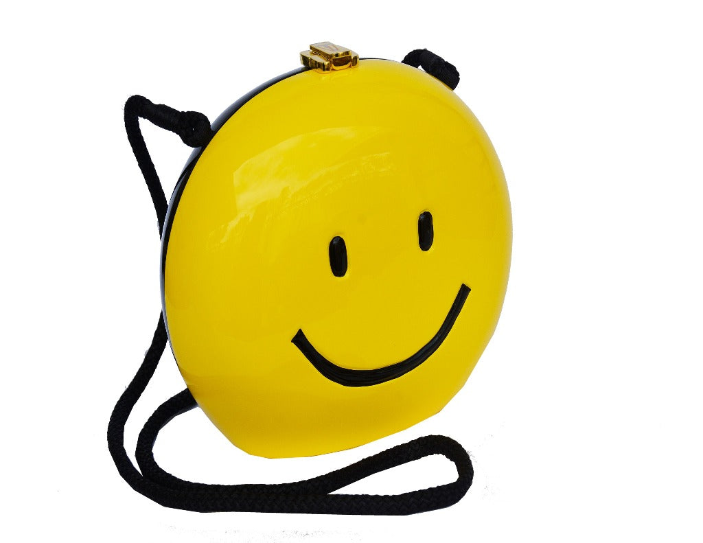 Discover the perfect blend of luxury and whimsy with our Smiley Handbag. This eye-catching accessory showcases a self-revealing yellow happy face and a sad black face, sure to spark conversations. Crafted with a black cord shoulder strap, TW lock, and handmade hinges, this handbag measures 7 1/2" H x 8" W x 3" D. Embrace the charm and make a statement by adding this playful twist to your ensemble.