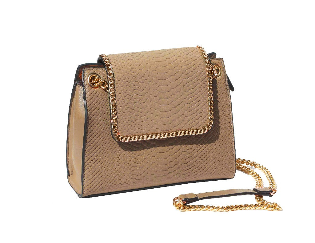 Indulge in luxury with the Timmy Woods Crossbody Bag. Crafted from elegant Vegan leather, the design features a textured Reptile skin pattern and a chic, Chain Link strap. The convenient magnetic flap and zipper open closure add a touch of exclusivity to this must-have accessory. With measurements of 6 1/2" in height, 9 1/2" in width, and 2 1/2" in depth, this bag is the perfect embodiment of sophistication. Elevate your style and make a statement with this stunning piece.