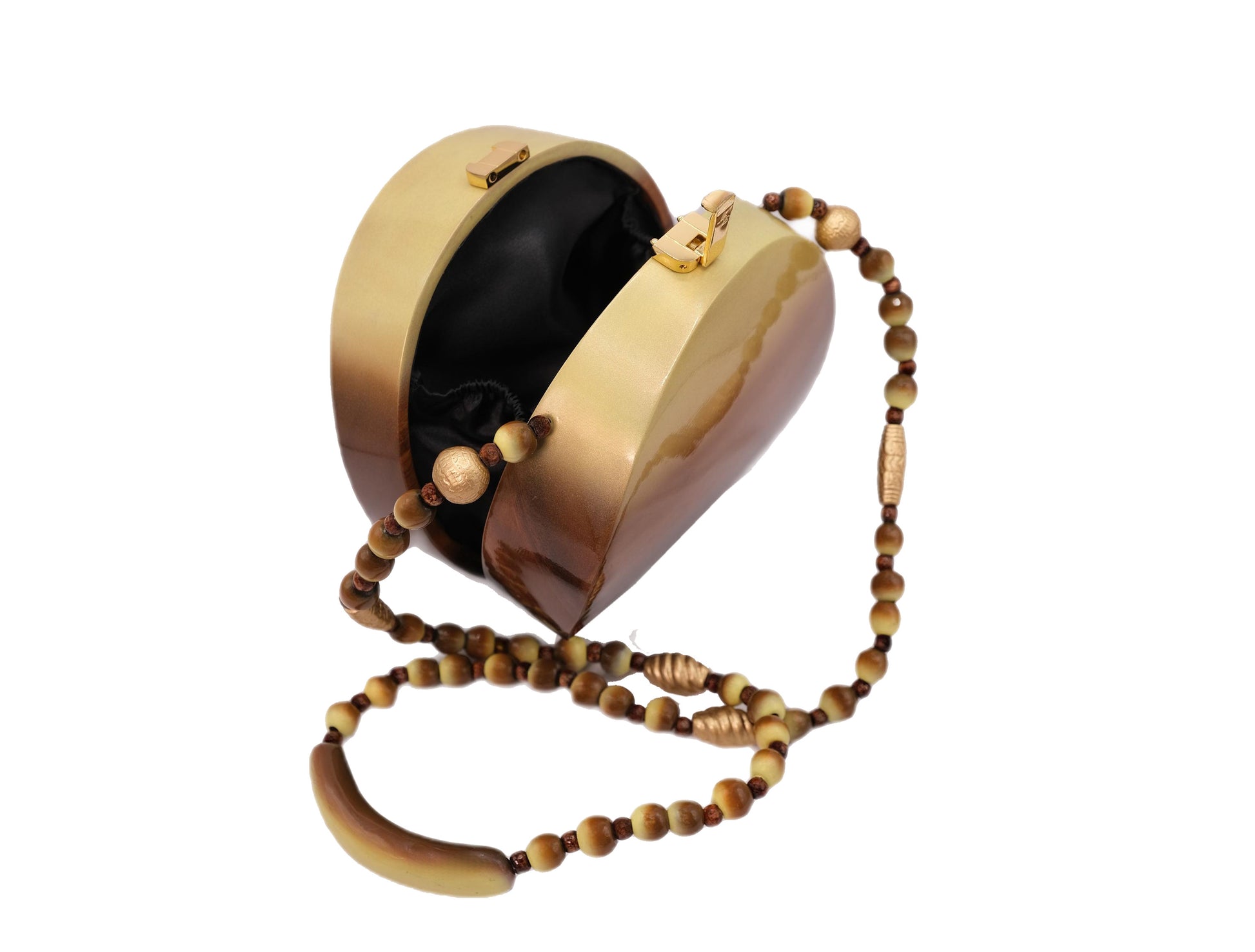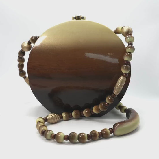 The bag is finished in a luxurious high-gloss lacquer, which is complemented by rich dark brown, bronze, and gold shading that adds depth and sophistication to its overall aesthetic. The contrasting tones give it a timeless elegance, perfect for both day and evening wear.