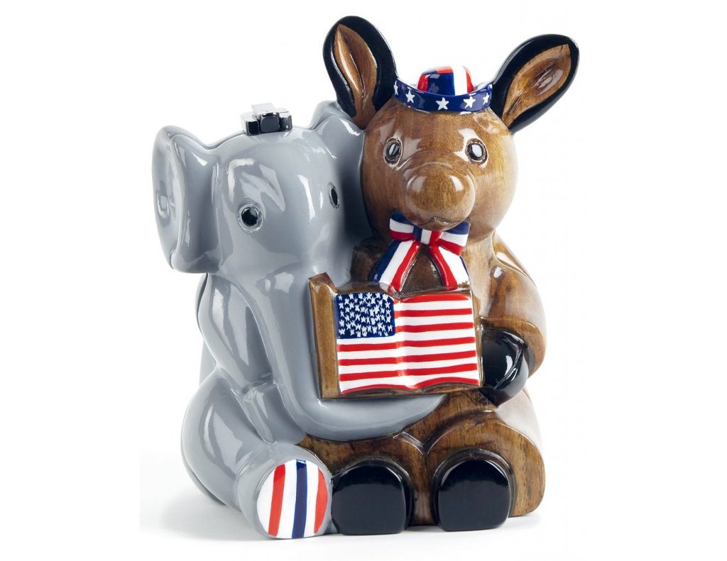 Bipartisan, show off your penchant for compromise. Both the Elephant and Donkey sit side by side in everything they do. Handmade from meticulously hand-carved Acacia Wood with the Donkey in natural wood and the Elephant hand-painted gray and bright red, white and blue, and include a cute hat and tie. High-gloss lacquer finish.