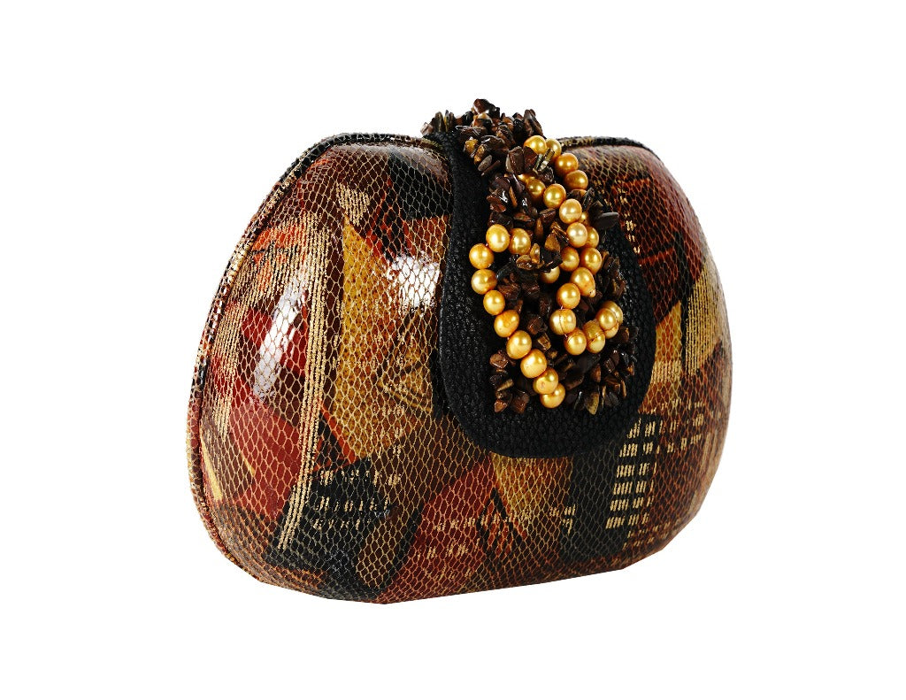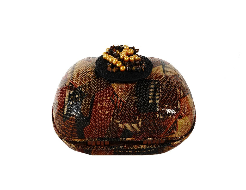 Nat Wood with full centerpiece design. The Bo is one of our most unique bags with its one of a kind hand painted detail and beaded enclosure.