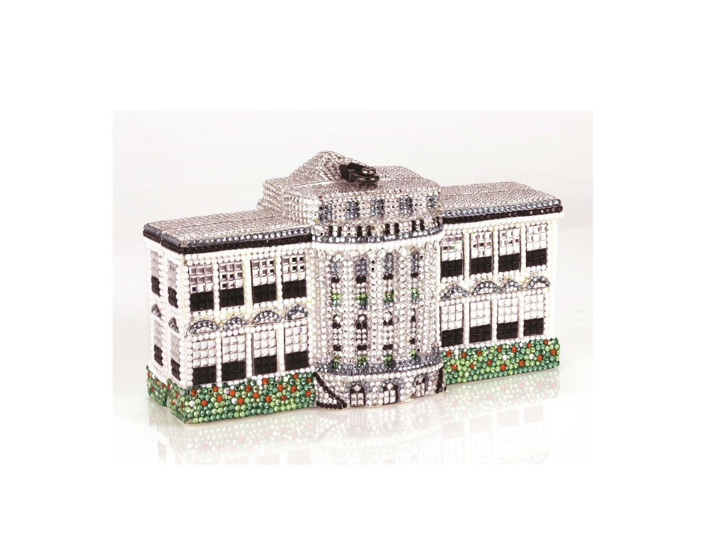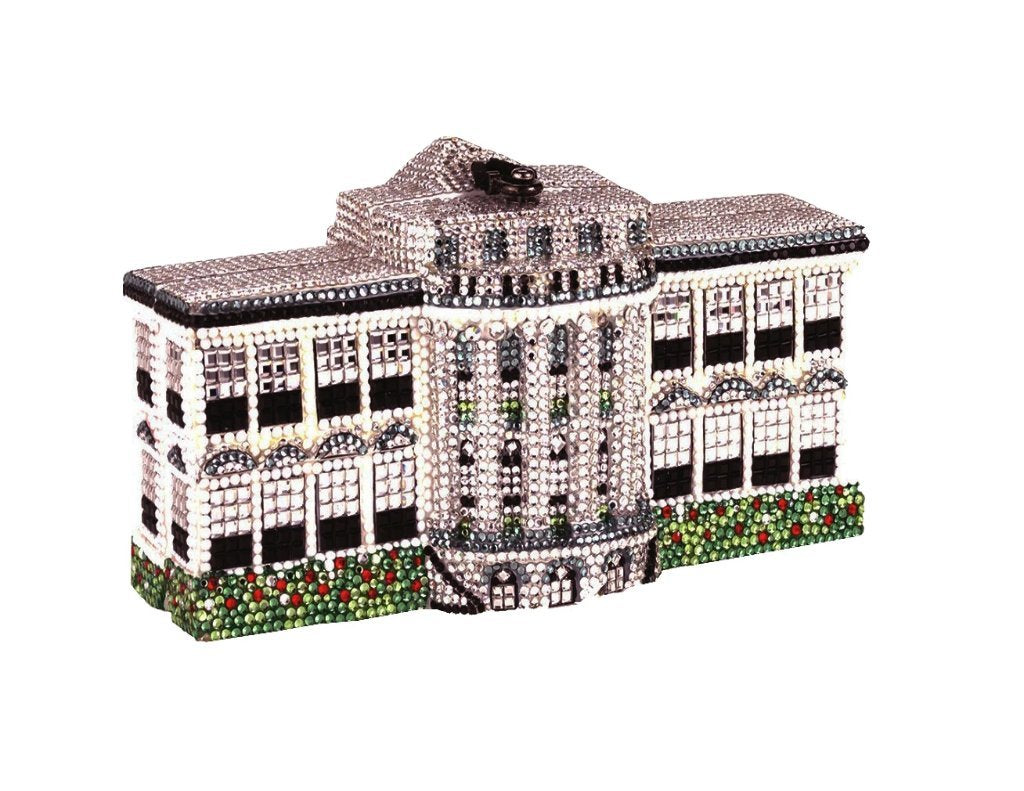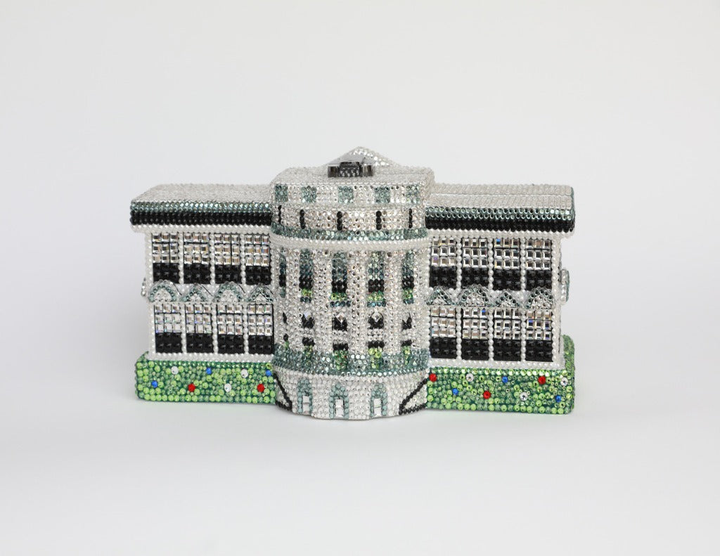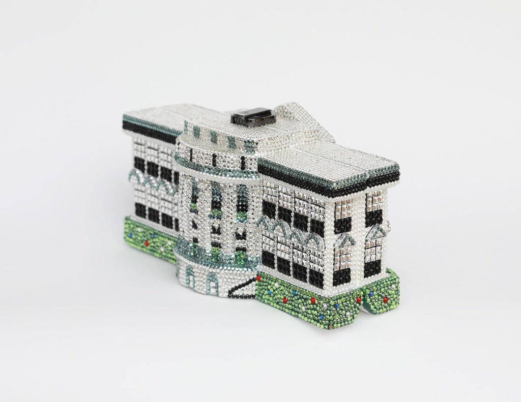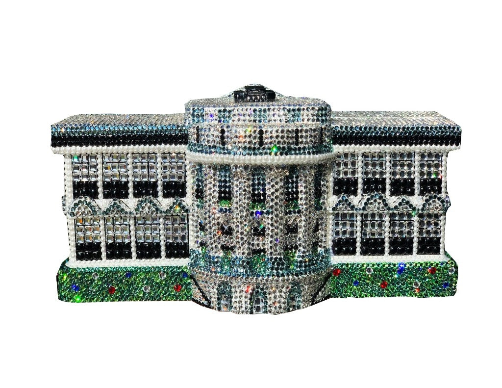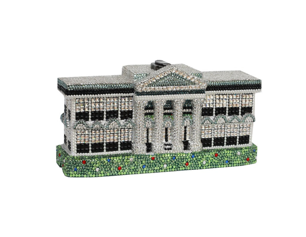 This luxury Limited Edition Wooden Handbag features an amazingly intricate design replicating the actual Washington, D.C. White House on both the front and back. The first of this edition was given to First Lady Laura Bush while President Bush was still in office. The White House handbag is handmade entirely from meticulously hand-carved acacia woods, and is fully encrusted with over 7,000 Swarovski™ Crystals for an incredible impact. It is hand-painted featuring a white background with black and gray building details accented by green landscaping. The detailing is truly remarkable and was very difficult to create. A true collectible, and it will never be made again