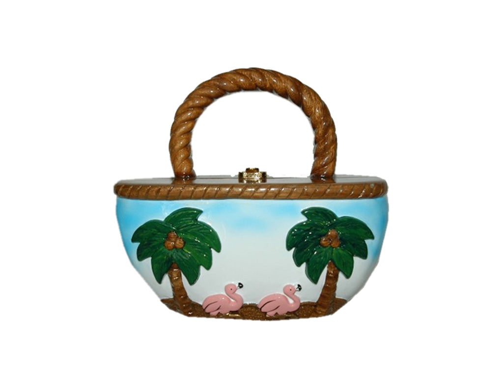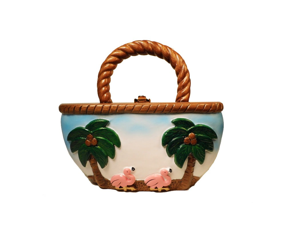 Bucket Shaped Handbag with Flamingos Walking on the front and the back of the bag the closure is a TW Lock holds most cell phones.