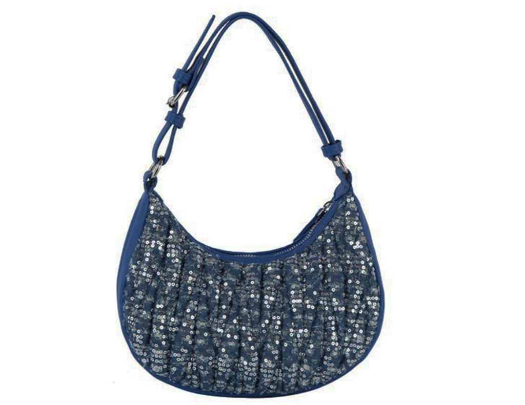 Experience the ultimate in sophistication with our Quilted Denim Mini Hobo Shoulder Bag. Meticulously crafted from denim canvas and embellished with delicate sequins, this exquisite bag boasts a zip top closure and opulent silver-tone hardware.
