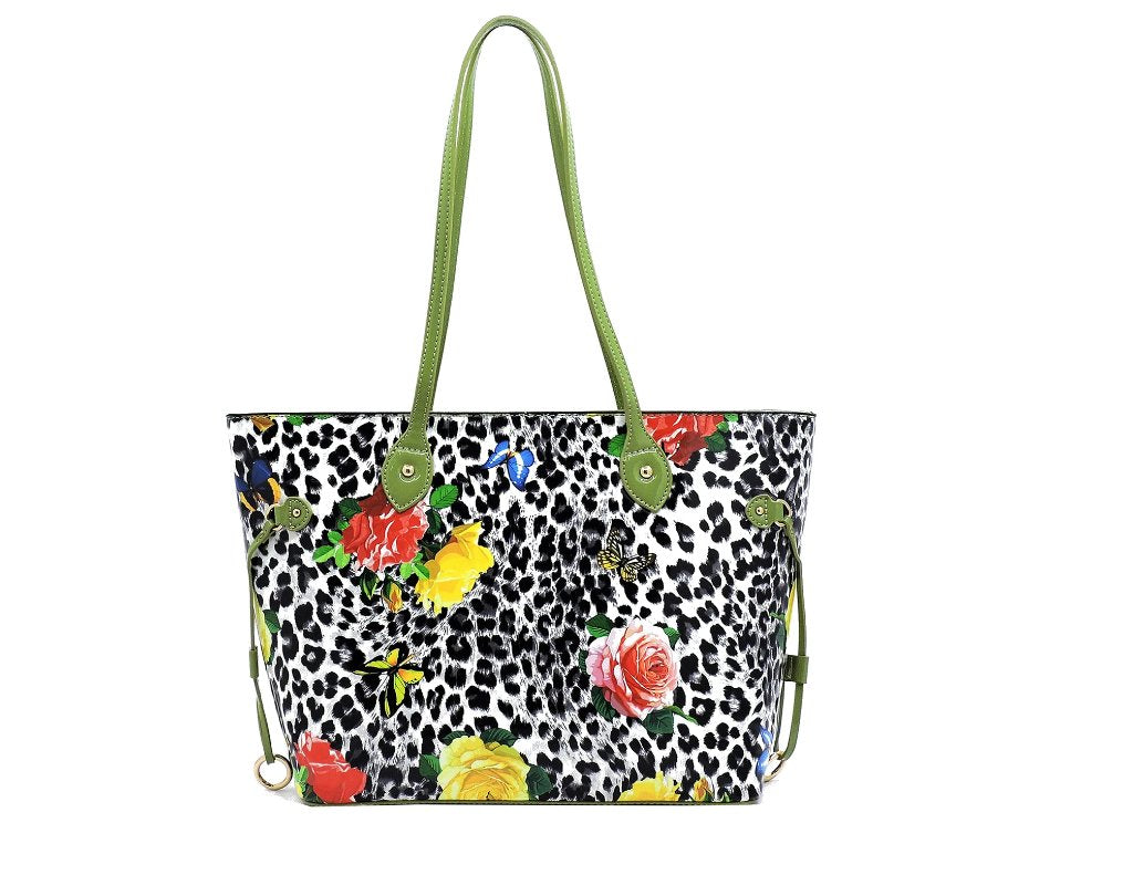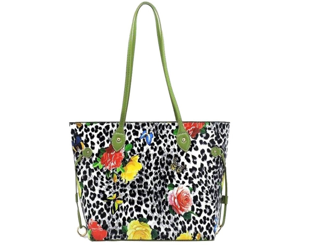 - Black & Mint Faux vegan leather Leopard Flower Shopper.