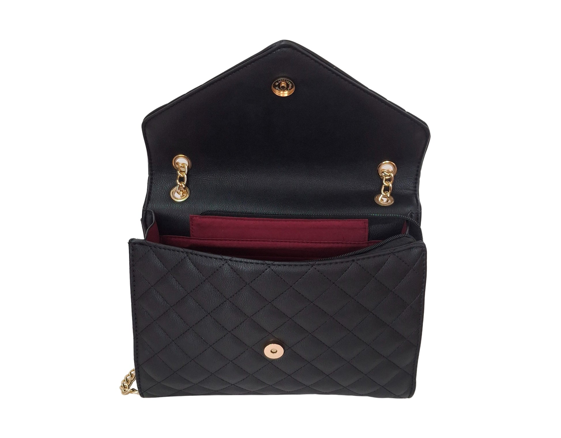 Made from luxuriously smooth, fine-textured Black vegan leather, this bag offers the feel of true sophistication without compromising on ethics. The classic envelope silhouette, accented with elegant quilt stitching, gives this piece a timeless charm, perfect for both day and evening wear.