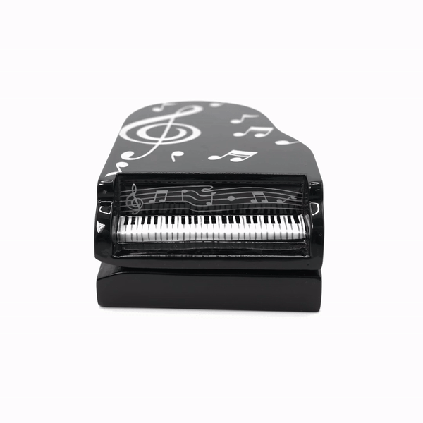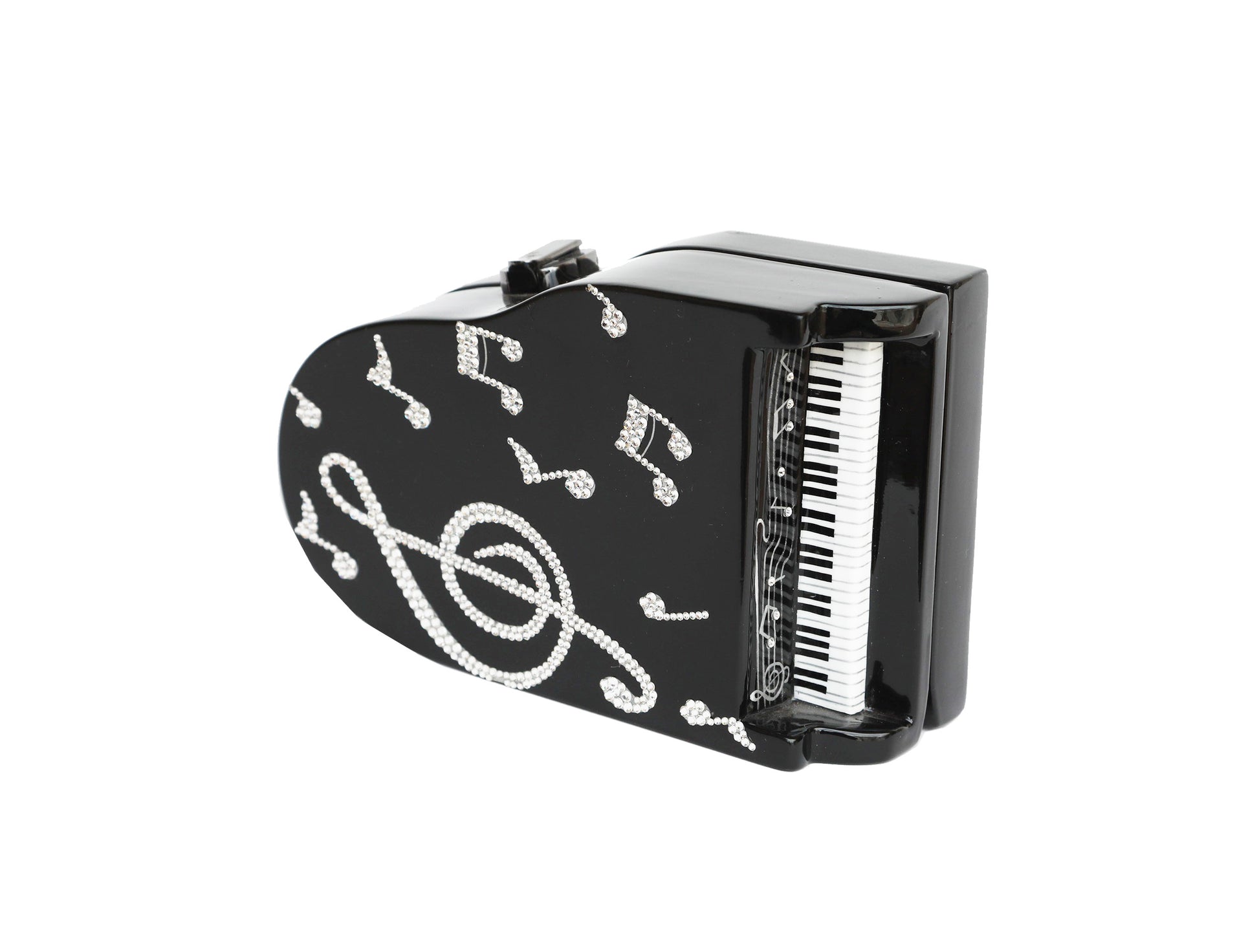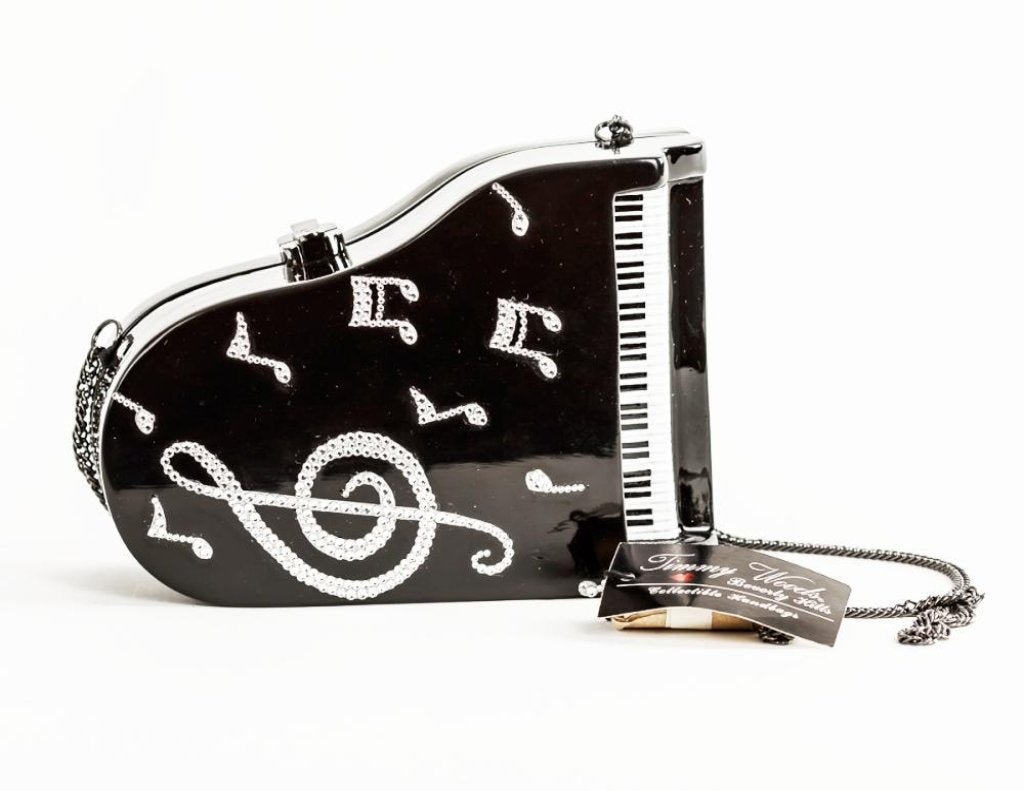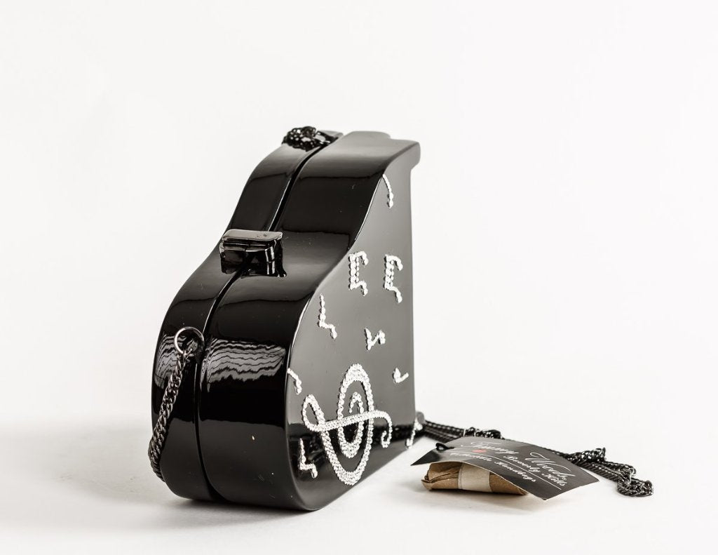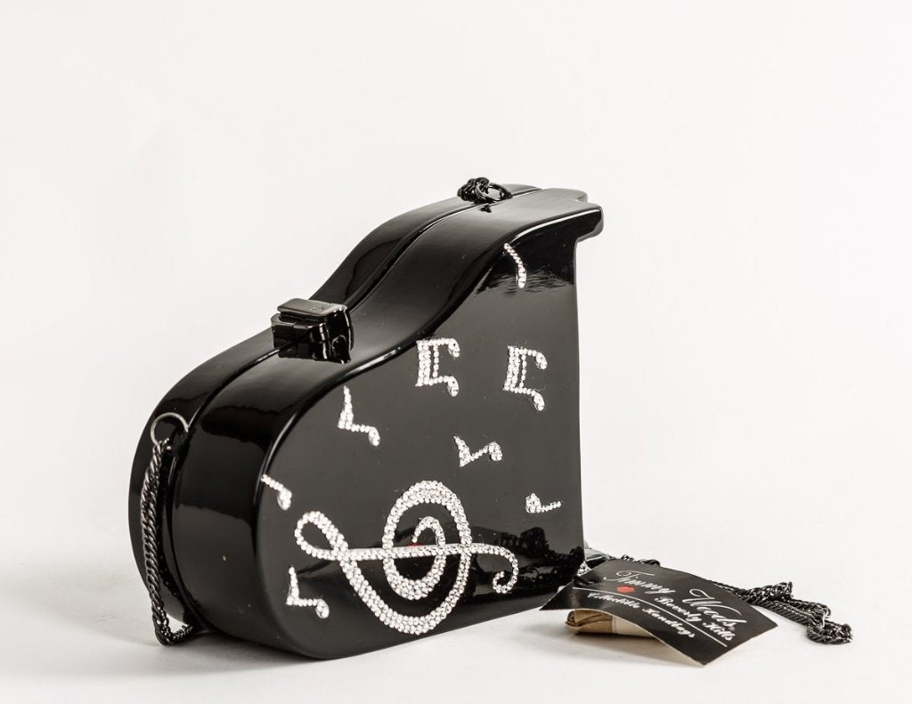 Heifetz Pianowith Swarovski® Crystals - Musical themed, inspired by the famed violinist. Handmade from carved Acacia wood with hand-painted black lacquer body with white keyboard and music notes accents. Finished in high gloss lacquer. Handbag Dimensions: 3 3/4" H X 7 1/4" W x 2 1/2" D. TW lock closure; Satin lining; Small inside pocket; Drop-in Shoulder Strap included