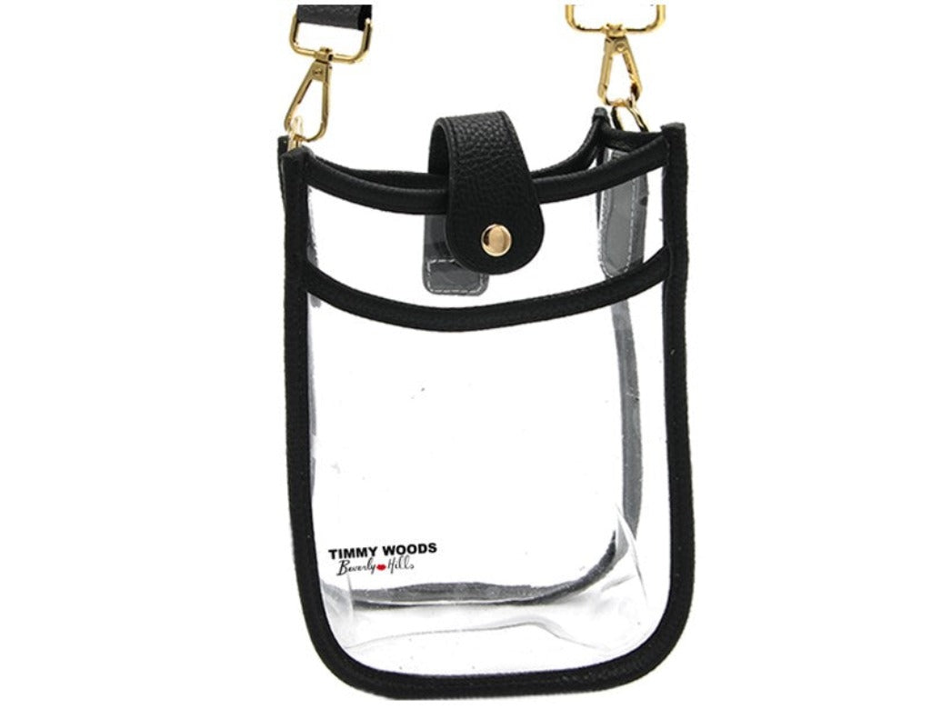 Timmy Woods Imani Bag. Is one of the most successful cross body shapes A Feedbag. Made in transparent Acrylic with a front pocket and a center snap. The attachable shoulder strap is 2" for comfort. Handbag Dimensions 8"H x 6" W x 2" D.