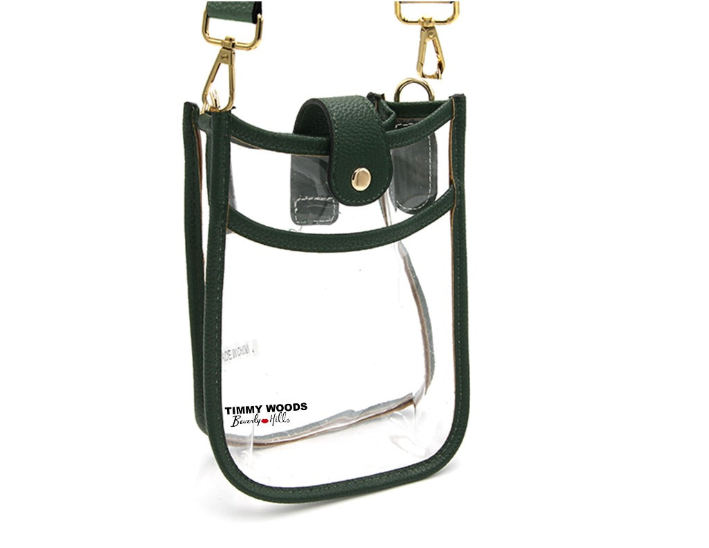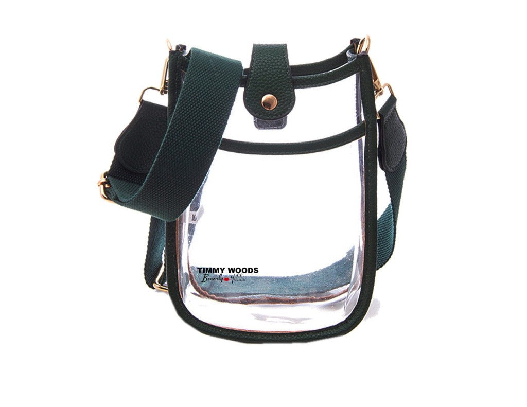 Timmy Woods Imani Bag. Is one of the most successful cross body Handbag. Made in transparent Acrylic with a front pocket and a center snap. The attachable shoulder strap is 2" for comfort. Handbag Dimensions 8"H x 6" W X 2" D.