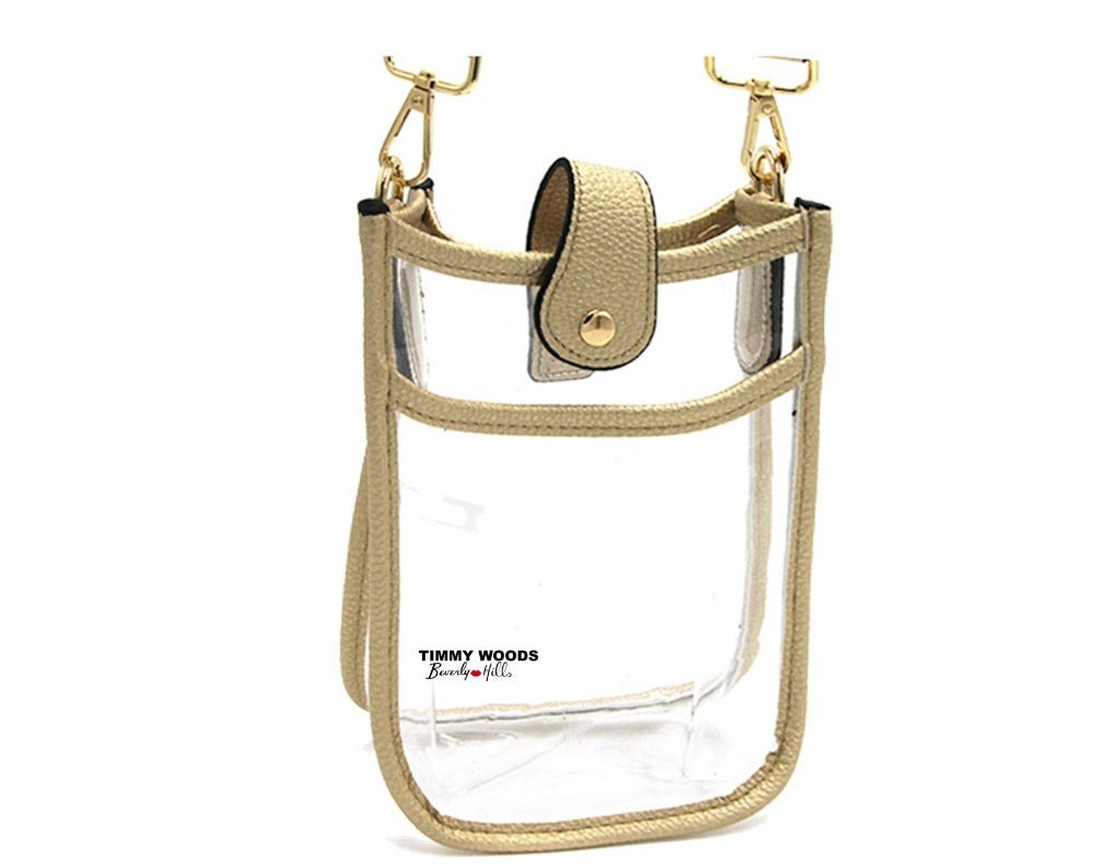 Timmy Woods Imani Bag. Is one of the most successful cross body shapes A Feedbag. Made in transparent Acrylic with a front pocket and a center snap. The attachable shoulder strap is 2" for comfort. Handbag Dimensions 8"H x 6" W X2" D.