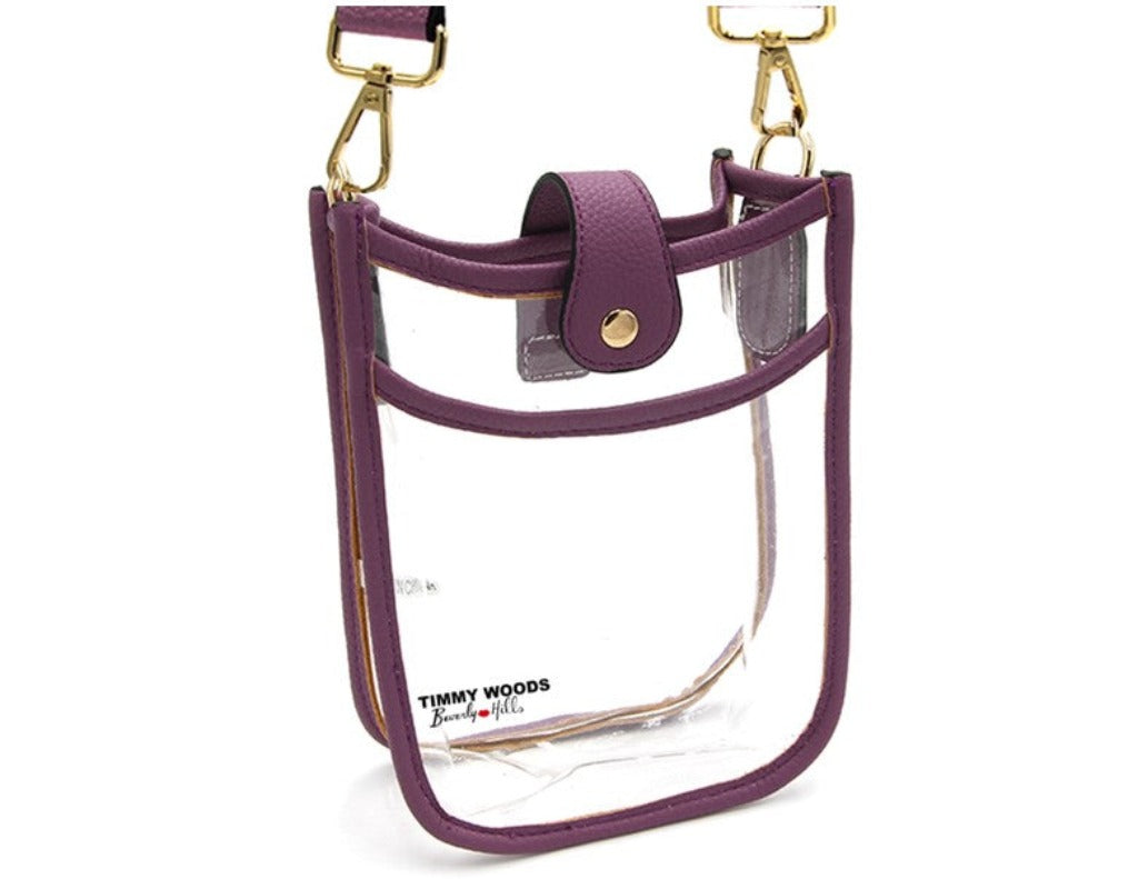 Timmy Woods Imani Bag. Is one of the most successful cross body shapes A Feedbag. Made in transparent Acrylic with a front pocket and a center snap. The attachable shoulder strap is 2" for comfort. Handbag Dimensions 8"H x 6" W X 2" D.