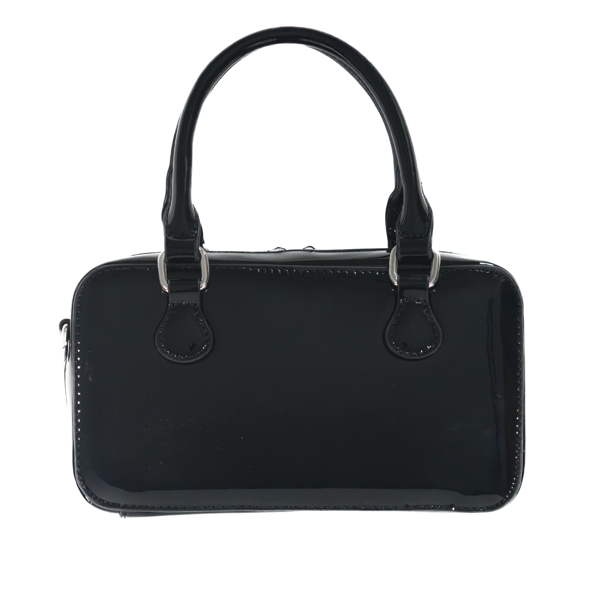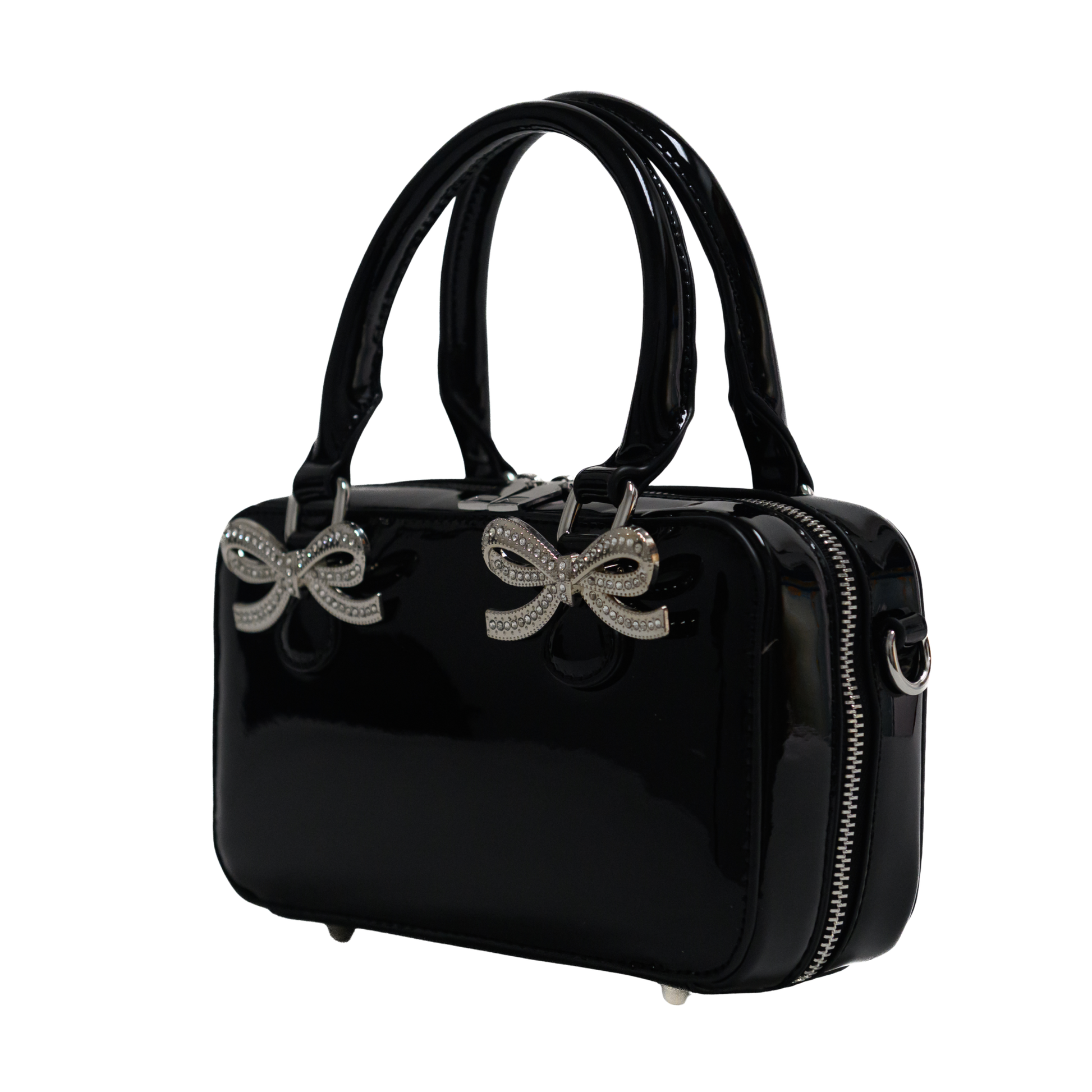 Crafted from glossy faux patent vegan leather, the bag features a sleek, structured silhouette enhanced by double top handles and polished silver-tone metal hardware. Delicate crystal-accented bow details on the front add a feminine, couture-inspired touch, making it perfect for both day sophistication and evening glamour.