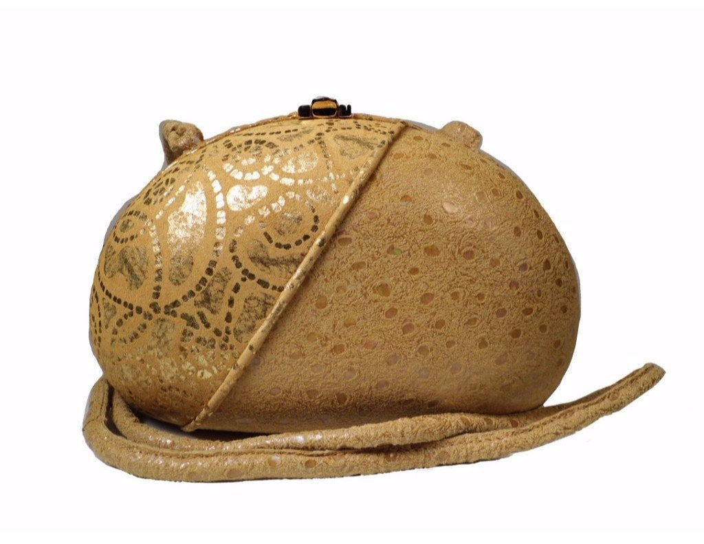Utilizing an ovoid shape, this handbag is carefully crafted from carved Acacia wood and adorned with two distinct leather overlays in gold and metallic patterns. Measuring (5" H x 9" W x 3" D), this handbag features a TW Lock Closure, satin lining, a small inside pocket, and a drop-in shoulder strap for added versatility.