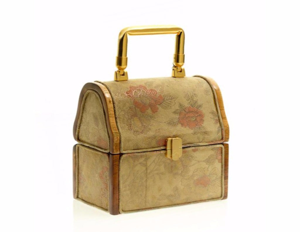 Very fun retro lunch box shape and design. Handmade from carved Acacia wood with natural wood tone body covered with textured leather overlays inside the natural wood edges. Overlay features a silk-screened soft flower pattern. All wood edges finished in high gloss lacquer. Topped with metal rectangular handle.