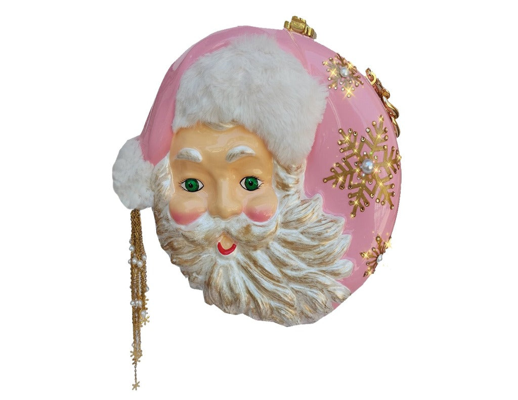 Highly Collectible and Beautiful. This Pink Santa has Pearls hanging from the Tassel and has assorted sizes of Snowflakes upon the chapeaux. Tassel is made with fresh water pearls and delicately assembled by a jeweler.