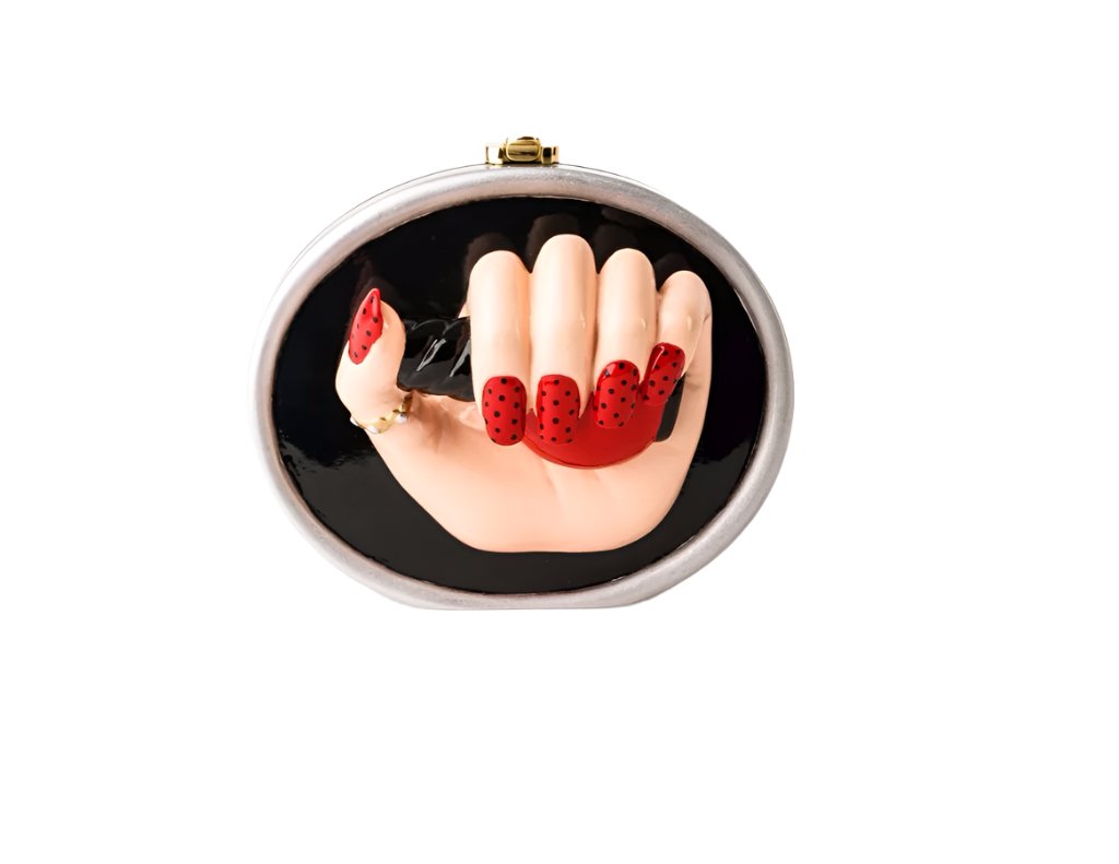A Hand Carved Hand With Beautiful Red Nails Holding A Bottle Of Nail Polish. Placed on an Oval Hand Painted Shape. This is a Sculpture, It Is Special! If you are in the Beauty Business This Handbag is A Must! Artist Know How Difficult It is to Make Hands, The Bag has a TW Lock, and a Drop In Shoulder Strap
