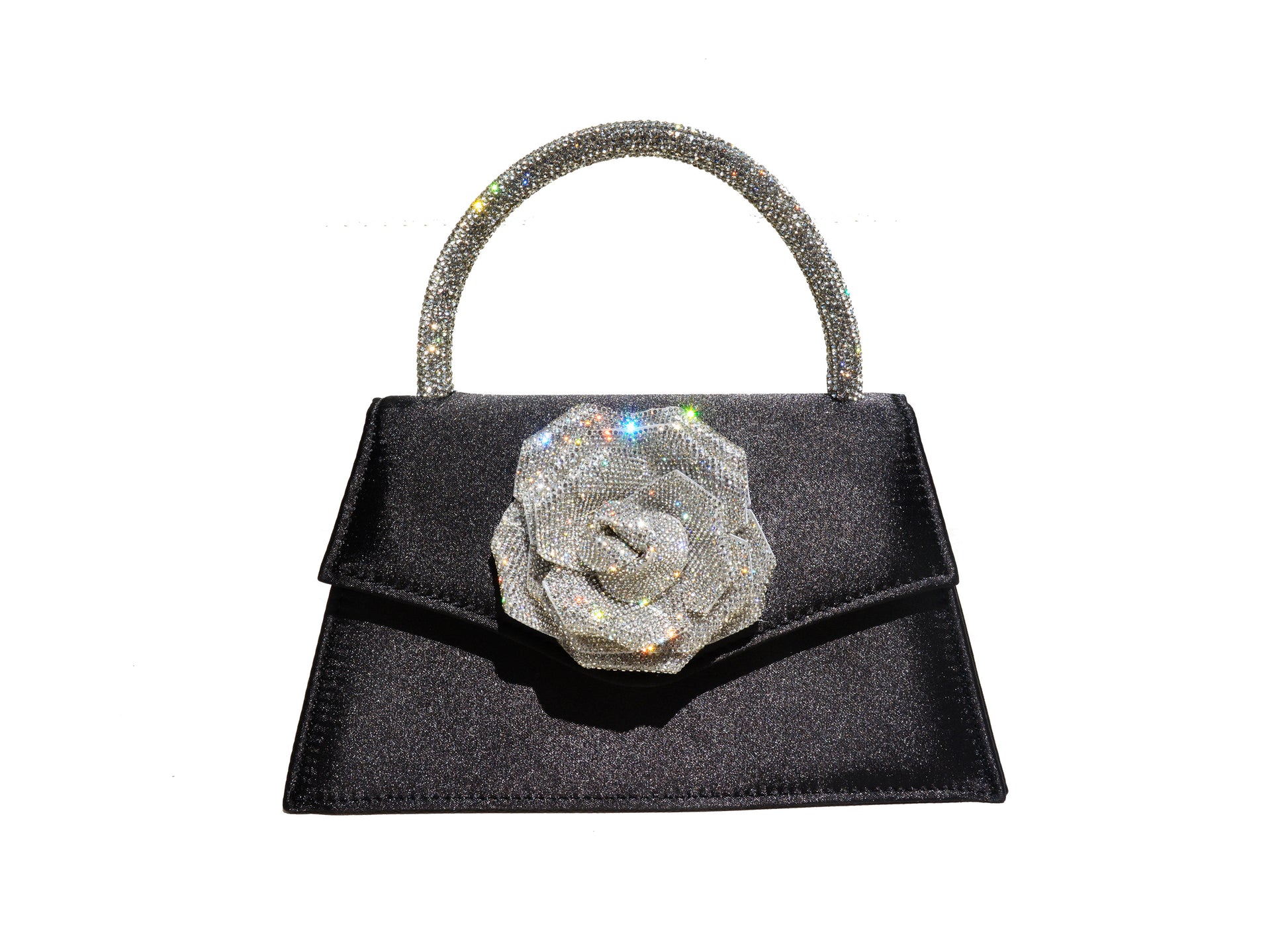 Rozie Handbag. Expertly crafted with luxurious silk-like and adorned with a dazzling cristallized handle featuring a beautiful crystal rose ornament, the Rozie Evening Handbag exudes elegance and sophistication. Its compact dimensions of 4 1/2" H x 8" W x 3" D make it a practical yet stylish accessory for any formal event.