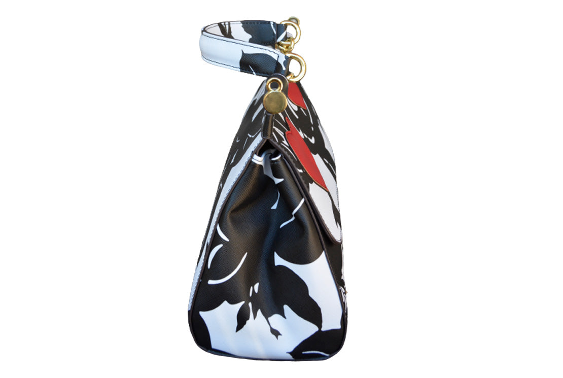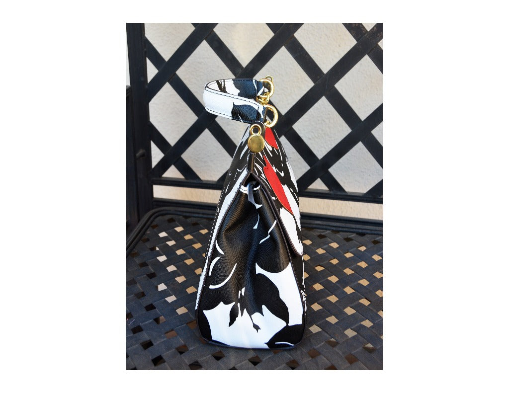 Matching Printed Vegan Shoulder Strap has adjustable Gold Hardware and can be worn Cross Body.