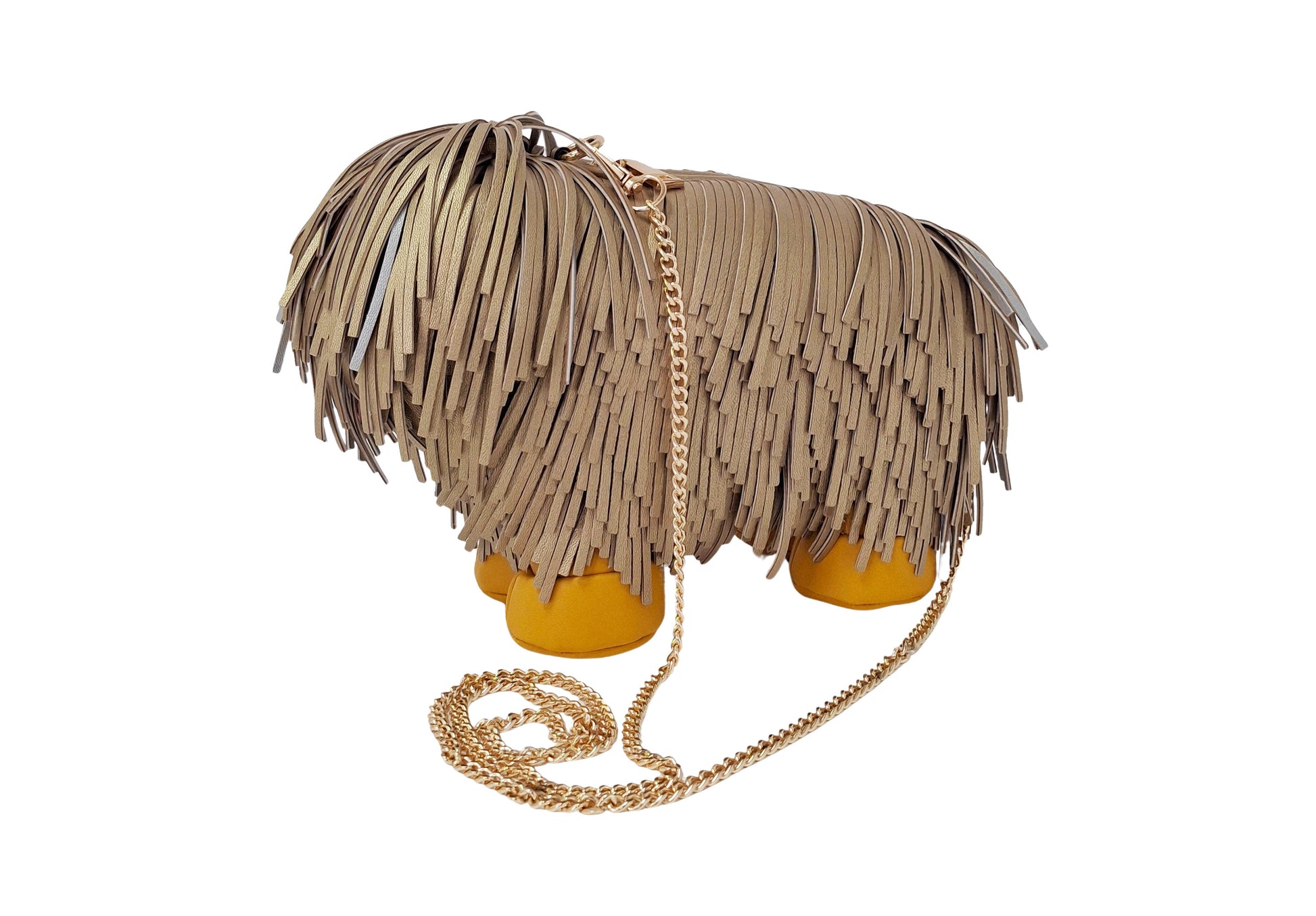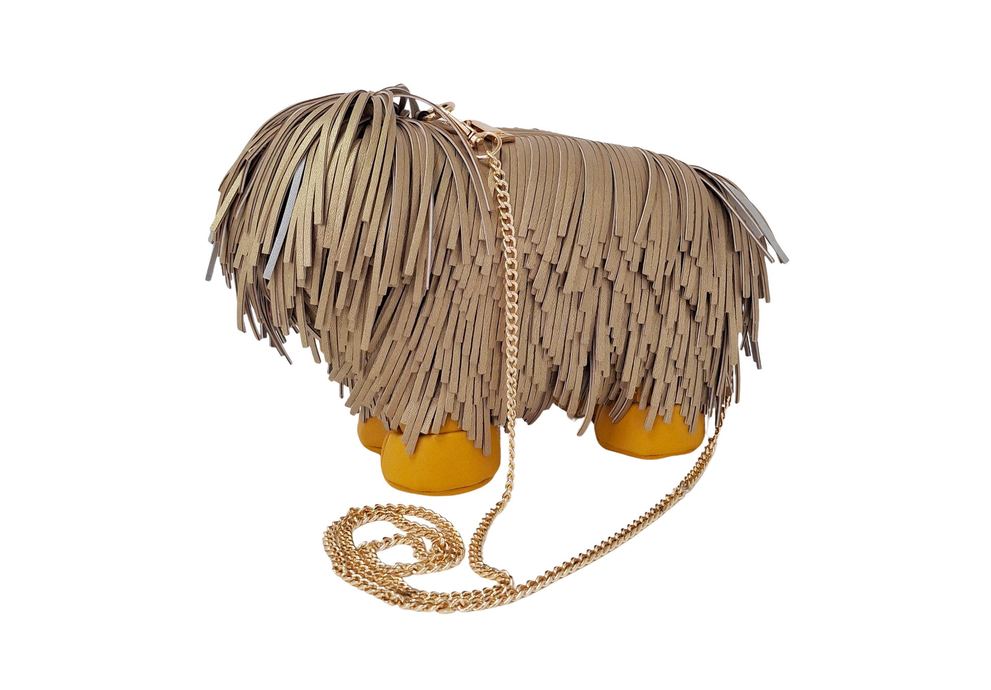 Meet the adorable baby Shaggie Dog, crafted from vegan leather with a playful shaggy fur appearance. This charming bag features black paws and a happy pink tongue peeking out from the fluffy faux fur.