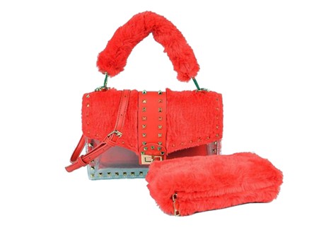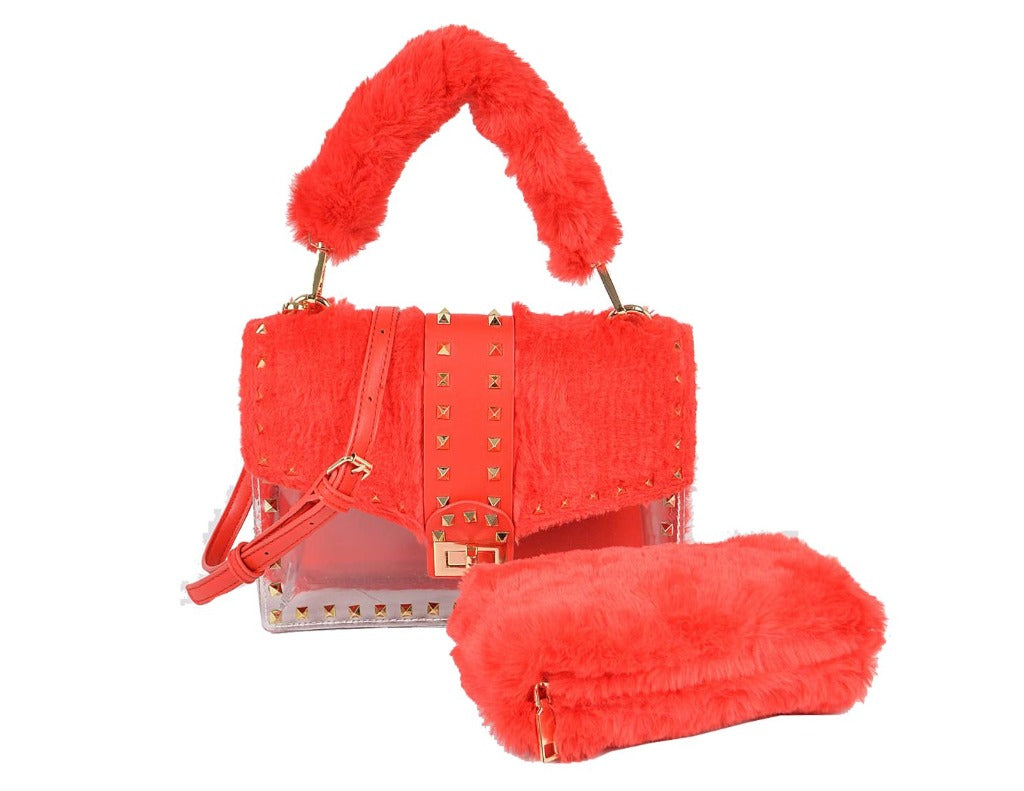 Timmy Woods Medium Faux red fur Studded Clear Clutch W/Mini Purse. Handbag Dimensions: 5 1/2" H x 9 1/2" W x 2 1/2"