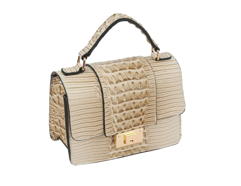 Faux-Croc/Alligator Satchel. Beige vegan leather Zip top closure. Gold-tone hardware. Detachable shoulder strap 6 1/2" x 8 1/2" x 3" D. -Durable faux-croc/alligator material for long-lasting use. - Large enough to fit all of your essentials without being too bulky. -Stylish gold-tone hardware adds a touch of elegance to any outfit. -Easily converts from a satchel to a crossbody bag. -Dimensions of 6 1/2" x 8 1/2" x 3" make it the perfect size for daily use or special occasions.