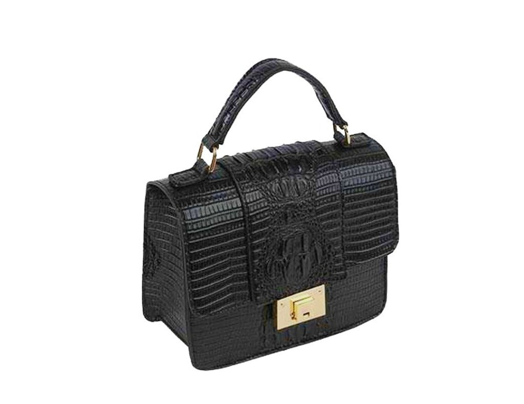 Faux-Croc/Alligator Satchel. Black vegan leather Zip top closure. Gold-tone hardware. Detachable shoulder strap 6 1/2" x 8 1/2" x 3" D A sophisticated, cruelty-free accessory. Gold-tone hardware offers a touch of elegance while maintaining practicality. Fits all your essentials and more in a compact design.
