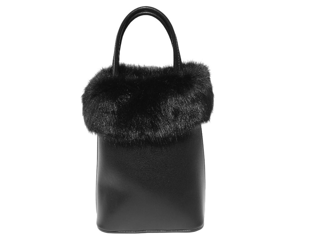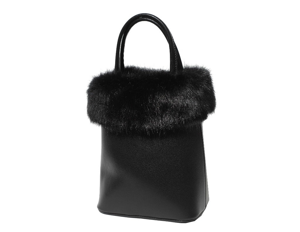 - Design: The bag has a sleek, black color with double handles for easy carrying. It also includes a faux fur decoration on the bucket-style top, adding a playful and luxurious touch to the overall look.