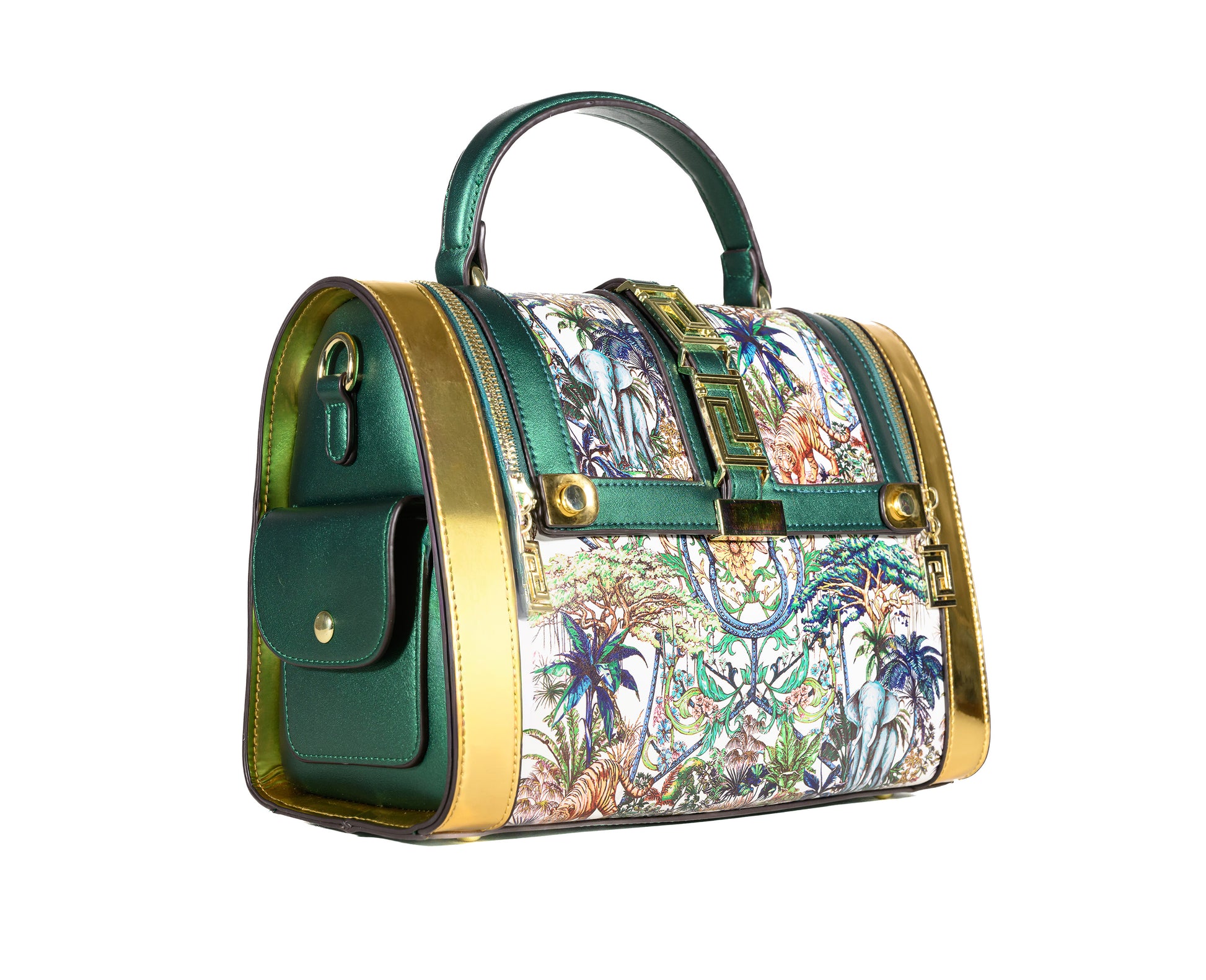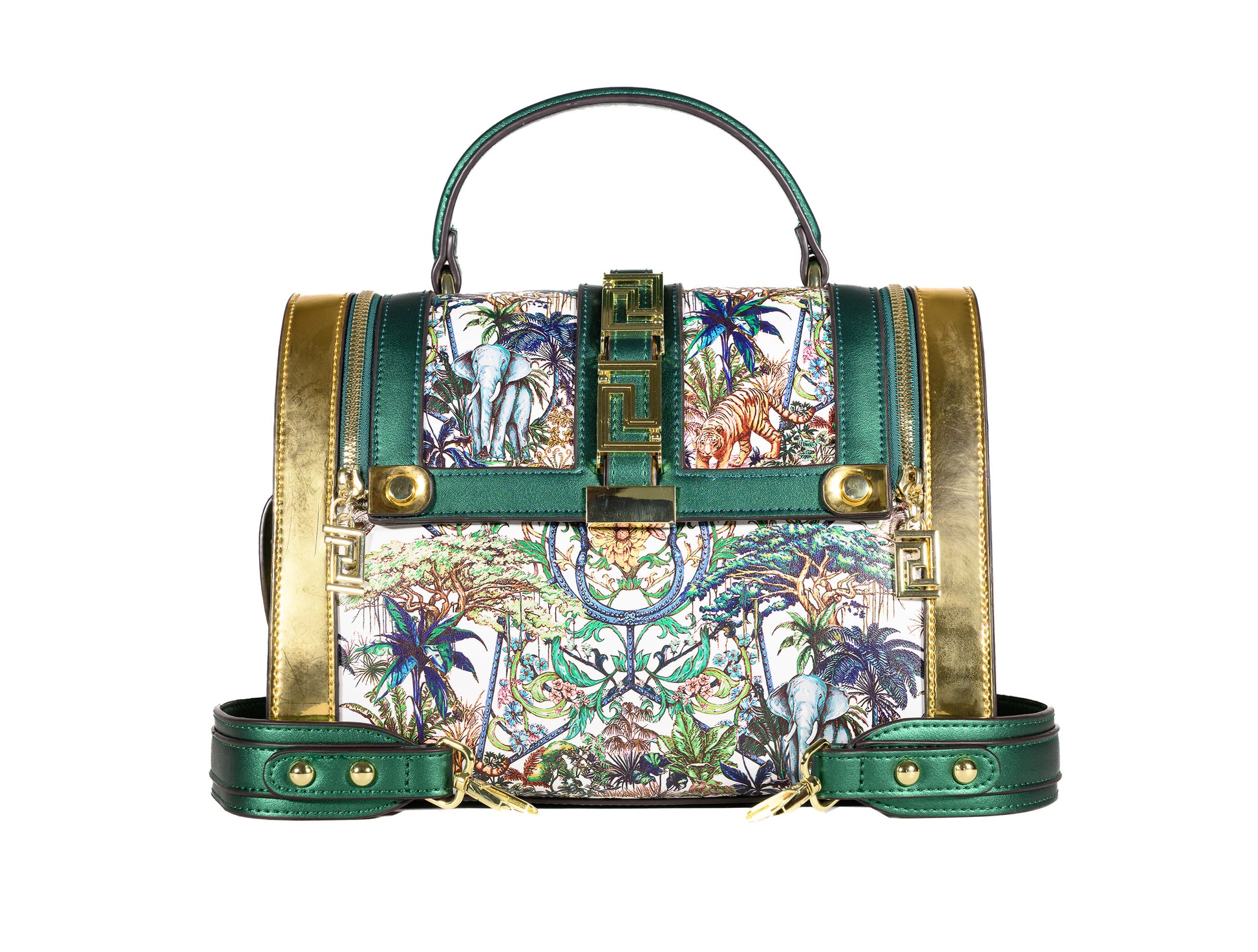 A vibrant expression of creativity and elegance, this Timmy Woods Beverly Hills vegan leather handbag highlights a captivating jungle motif with intricate depictions of exotic wildlife and lush greenery. Accented with deep green panels and gleaming gold hardware, it radiates sophistication and charm.