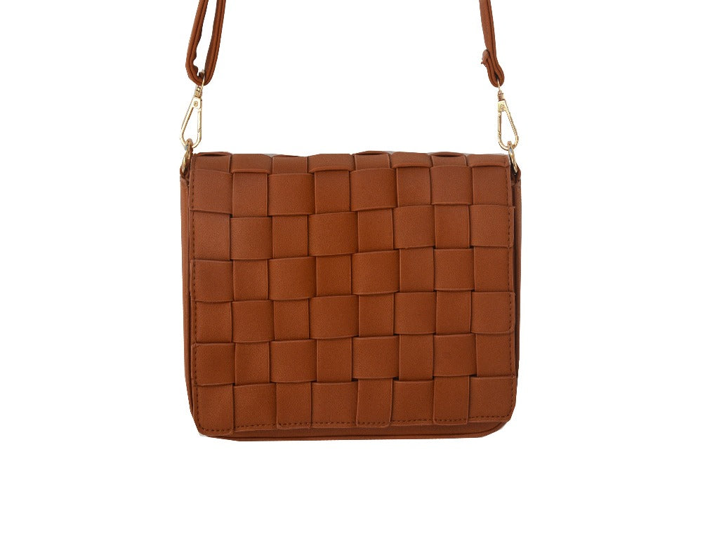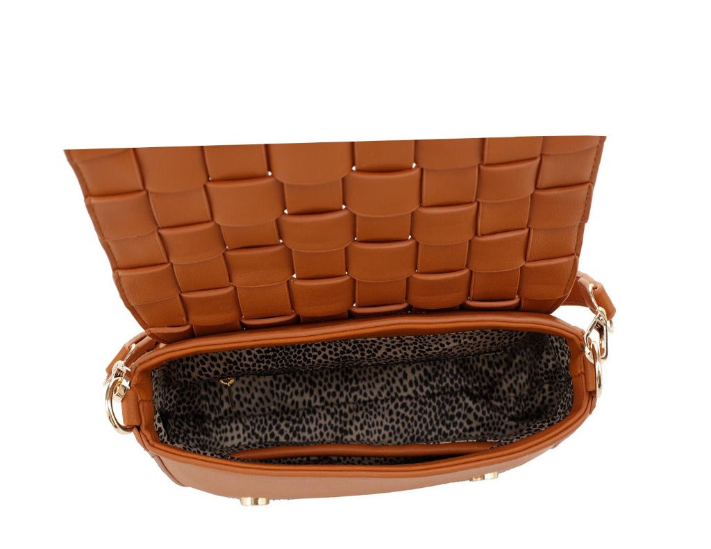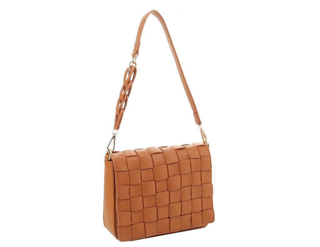 Expertly crafted and designed, the Timmy Woods Lui shoulder bag boasts a beautiful woven flap made of durable, brown faux vegan leather. With a secure magnetic snap closure and gold-tone hardware, this bag also offers versatility with two detachable shoulder straps. Its compact size of 7" H x 10" W x 3" D makes it the perfect accessory for any occasion.