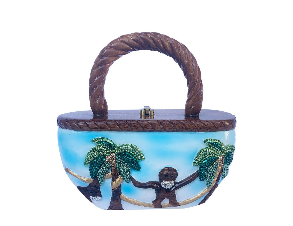 Bucket Shaped Monkey with Palm Trees that are encrusted with Swarovski Crystals and the Monkey wears a mask for protection from humans… lol. The Handbag is Hand Carved of Acacia Wood even the Hinges are Handmade a TW Top Lock and holds a cell phone.