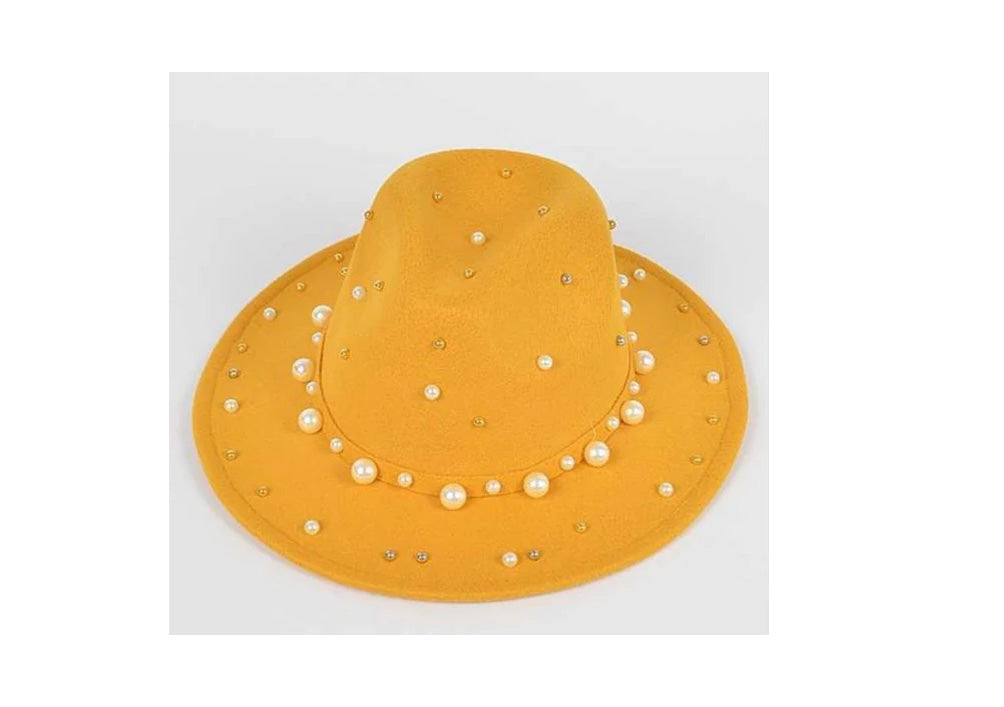 Timmy Woods Women’s Fashion yellow Hat with Faux Pearl Embellishments.