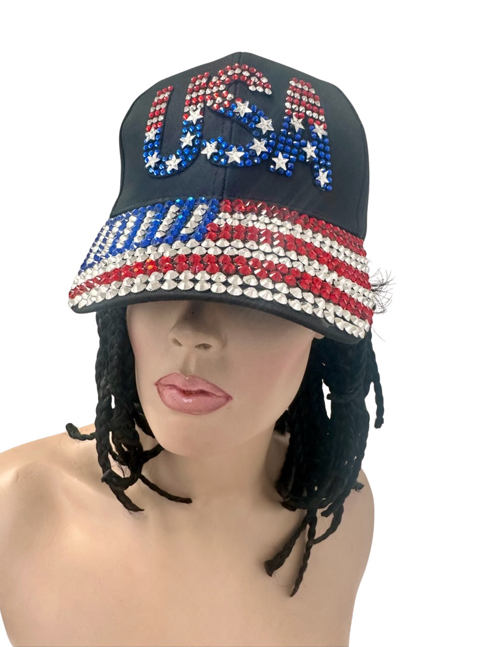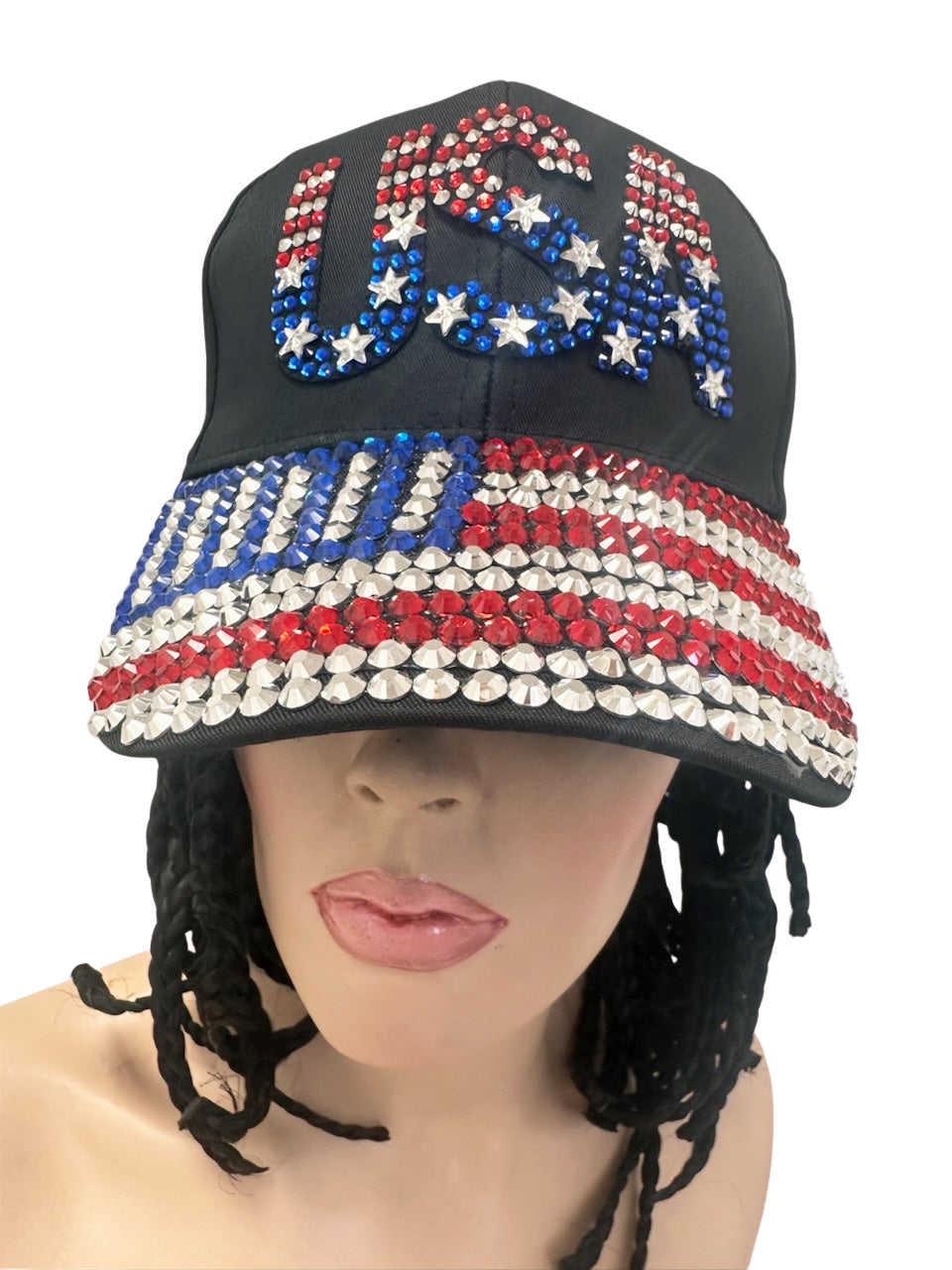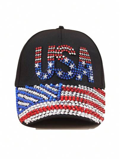 Curved Brim with Rhinestones: Along the brim, use a mix of red, white, and blue rhinestones to create a sparkling border. You could opt for a subtle gradient or wave pattern that mimics the flow of the American flag, from red to white to blue, or even add some stars in the blue area to further enhance the flag design.
