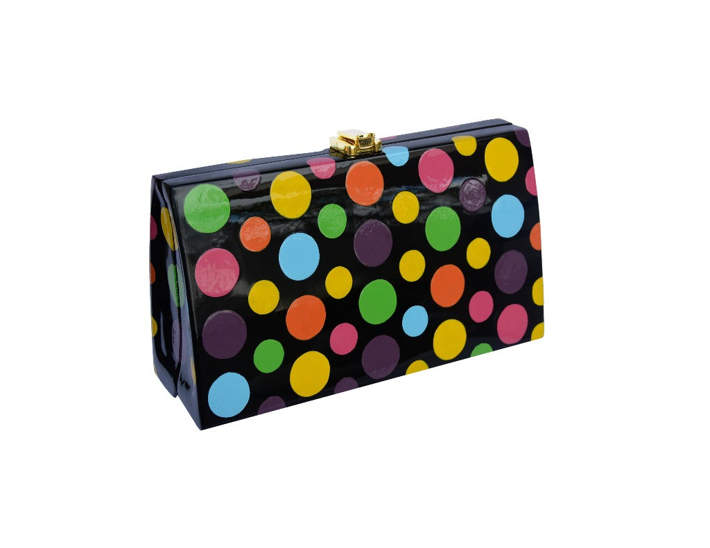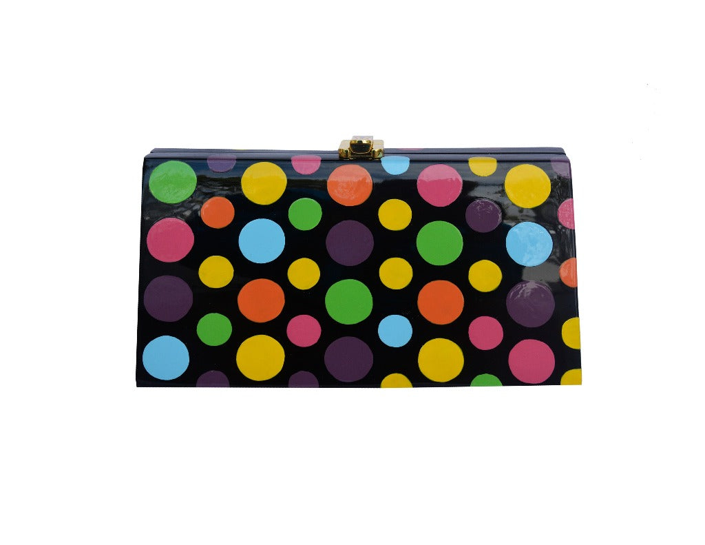 Pastel Polka Dots Handbags. Dottie. Handmade from carved Acacia wood with hand-painted details.TW Metal Closure, Black Lining and & Golden Chain shoulder strap. This gorgeous bag holds cell phone.