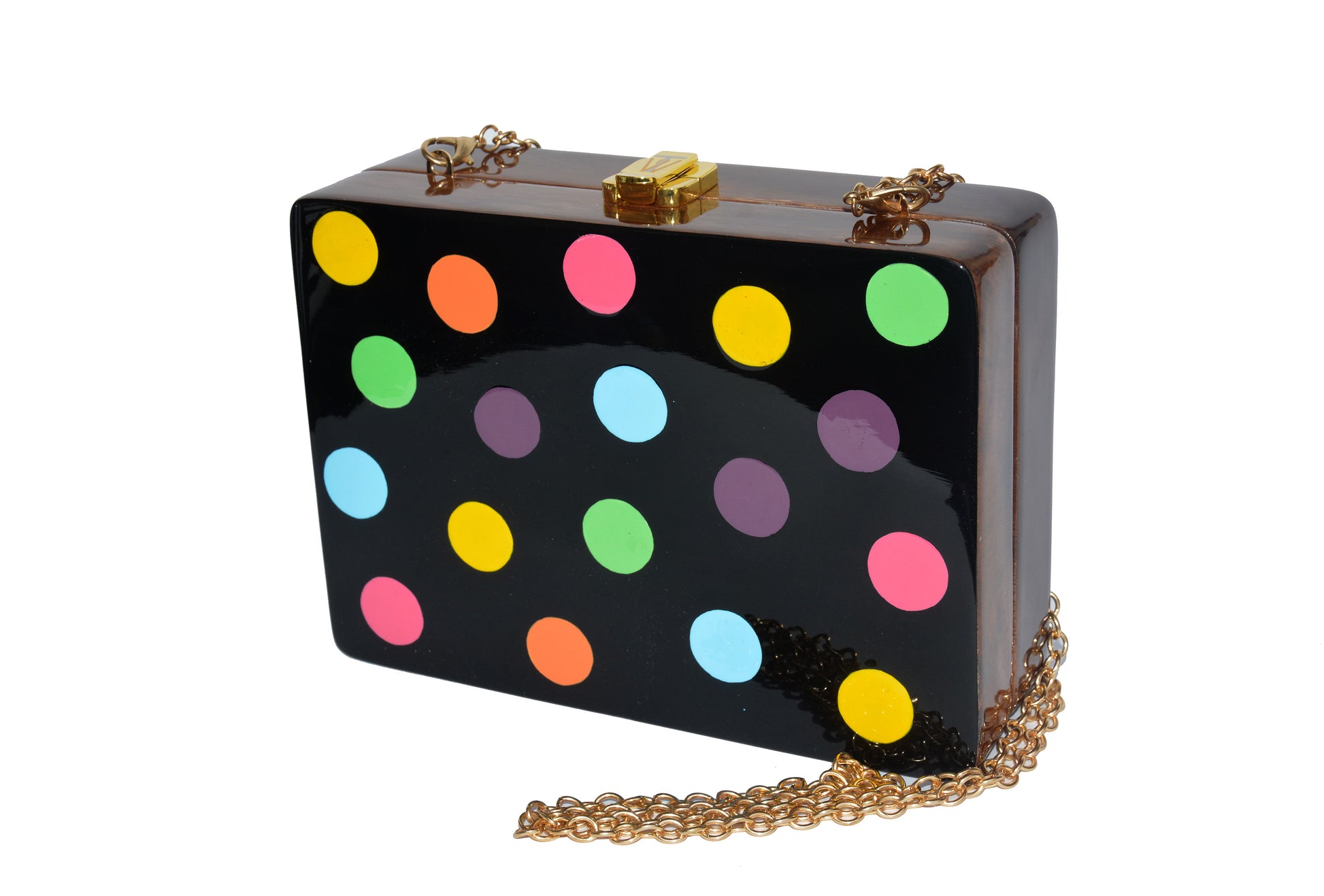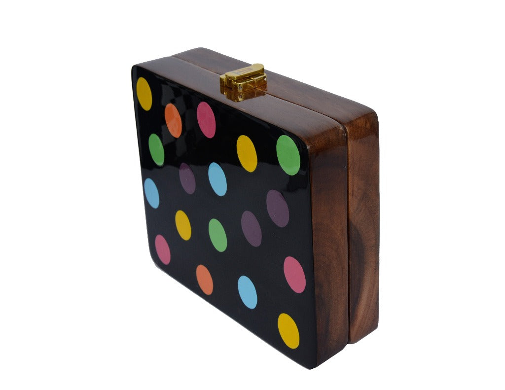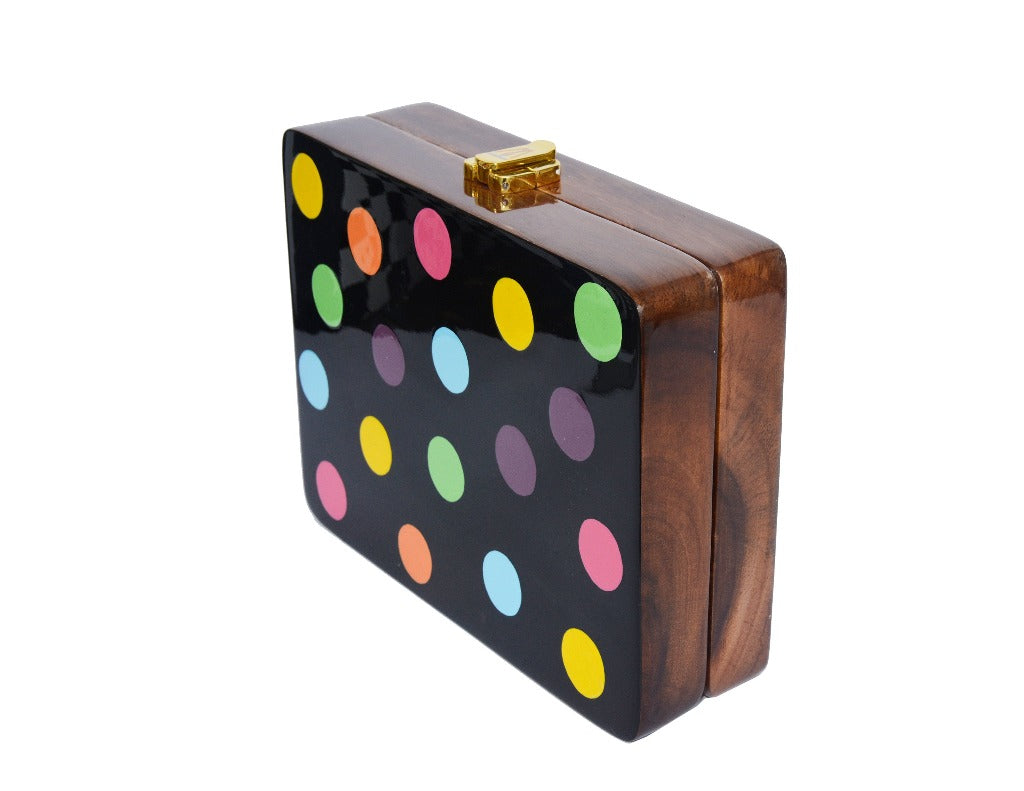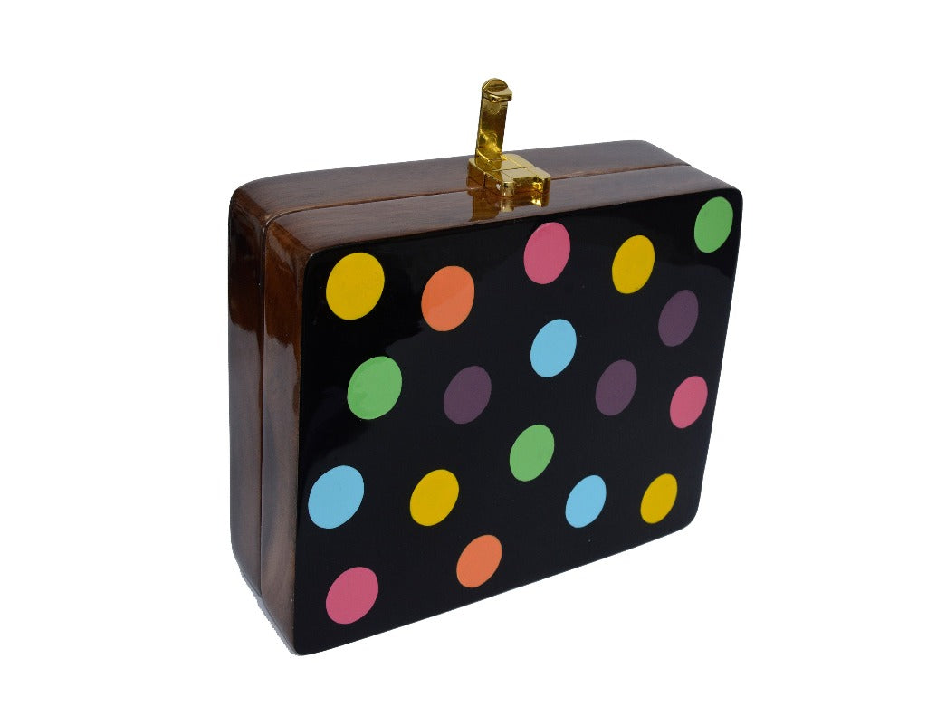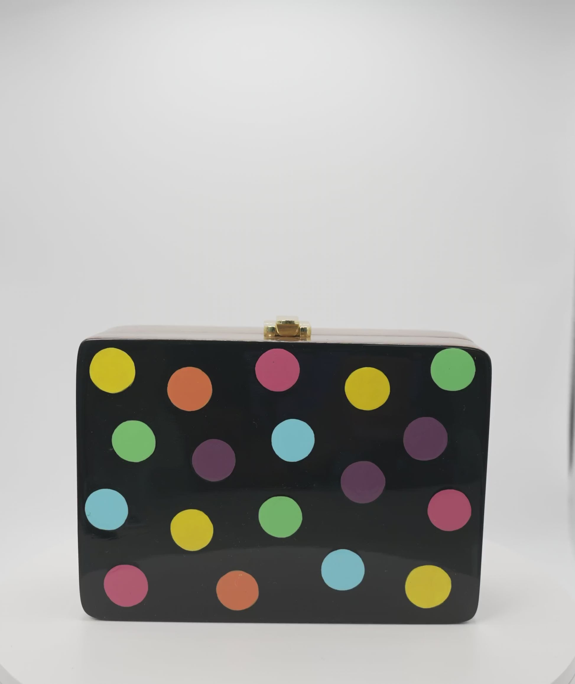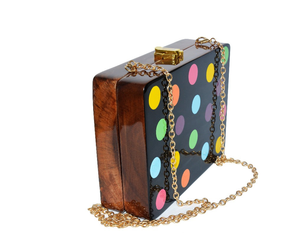 Sleek and classic, meet the Valerie. A one-of-a-kind clutch with charming Pastel Polka Dots. This exquisite piece is carefully crafted from hand-carved Acacia wood and adorned with delicate hand-painted details. Complete with a black lining, TW metal closure, and a golden chain shoulder strap, this luxurious bag is the perfect accessory for any occasion. With dimensions of 6” H x 8” W x 2 1/2” D, it is the perfect size to hold your cell phone and essentials.